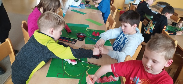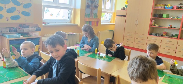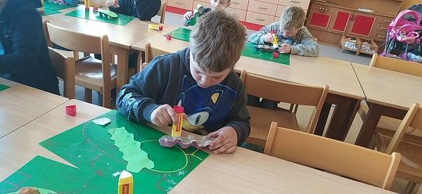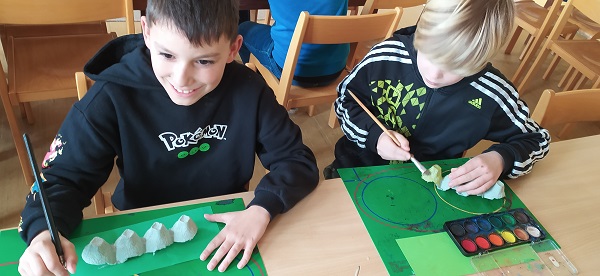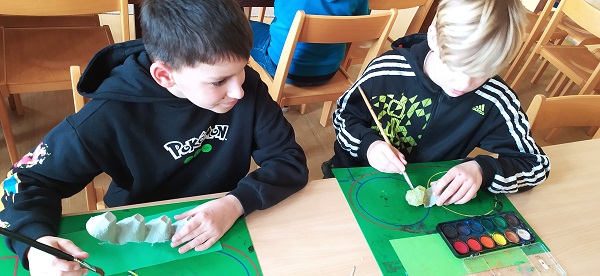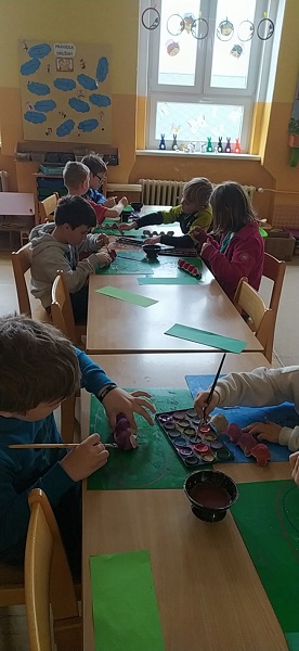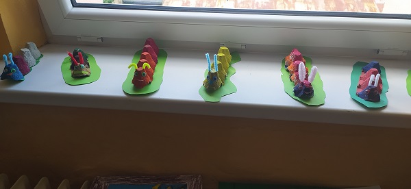 V družině používáme různé druhy materiálů a technik. Z plat od vajec vznikly barevné housenky.
