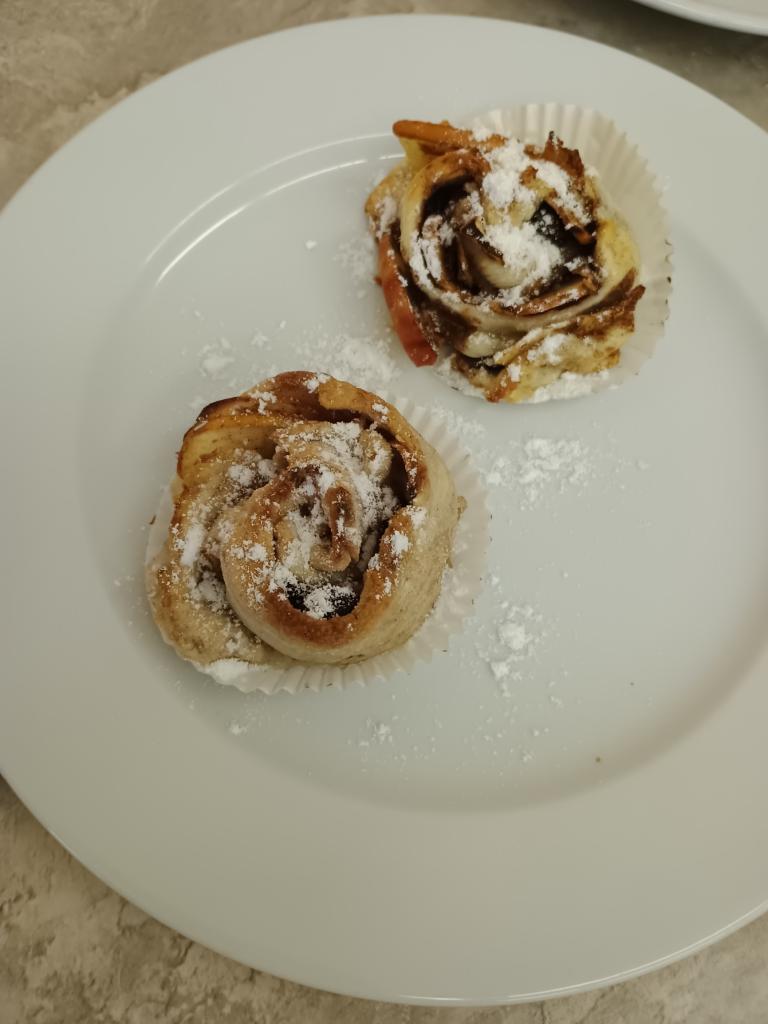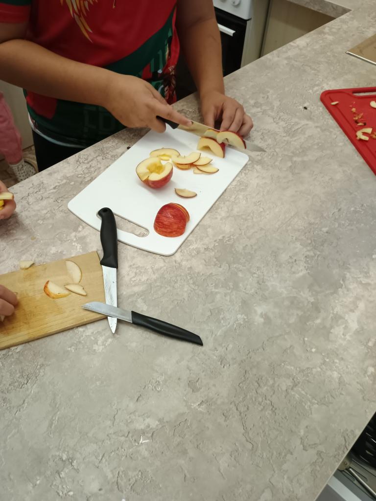 Na jídelníčku byly „kuřízky“ a brambory, jedna skupina měla opékané dukátky, samozřejmě domácí. Jako dezert si žáci upekli jablečné růžičky v listovém těstě. A jak jim chutnalo!!!!!!
