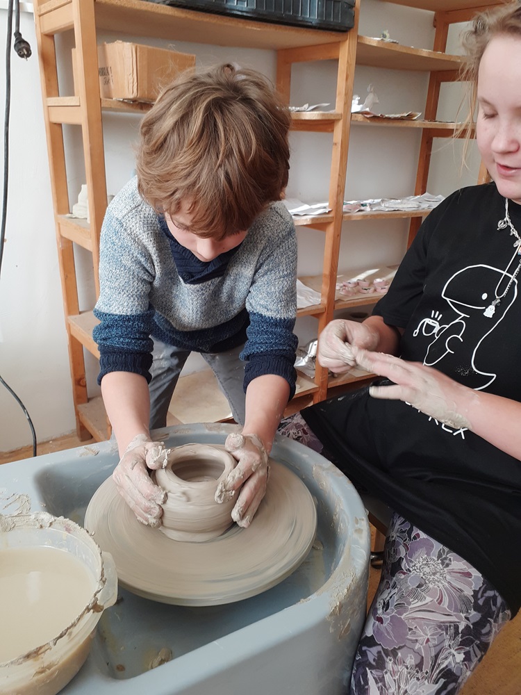 Kroužek se rozjel do 2. pololetí pro žáky z 1. stupně. Práce s hlínou nás velmi baví. Střídáme se na hrnčířském kruhu a zkoušíme vytočit první hrníčky či vázičky každé pondělí.