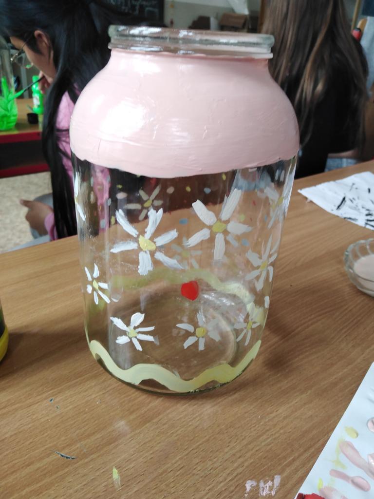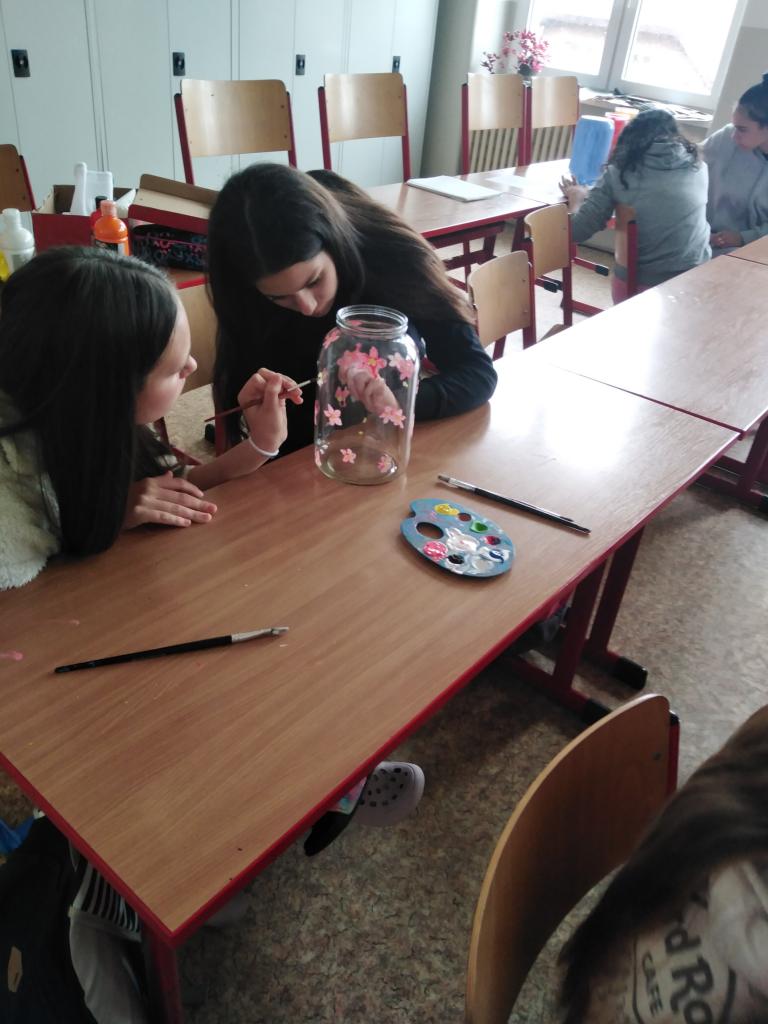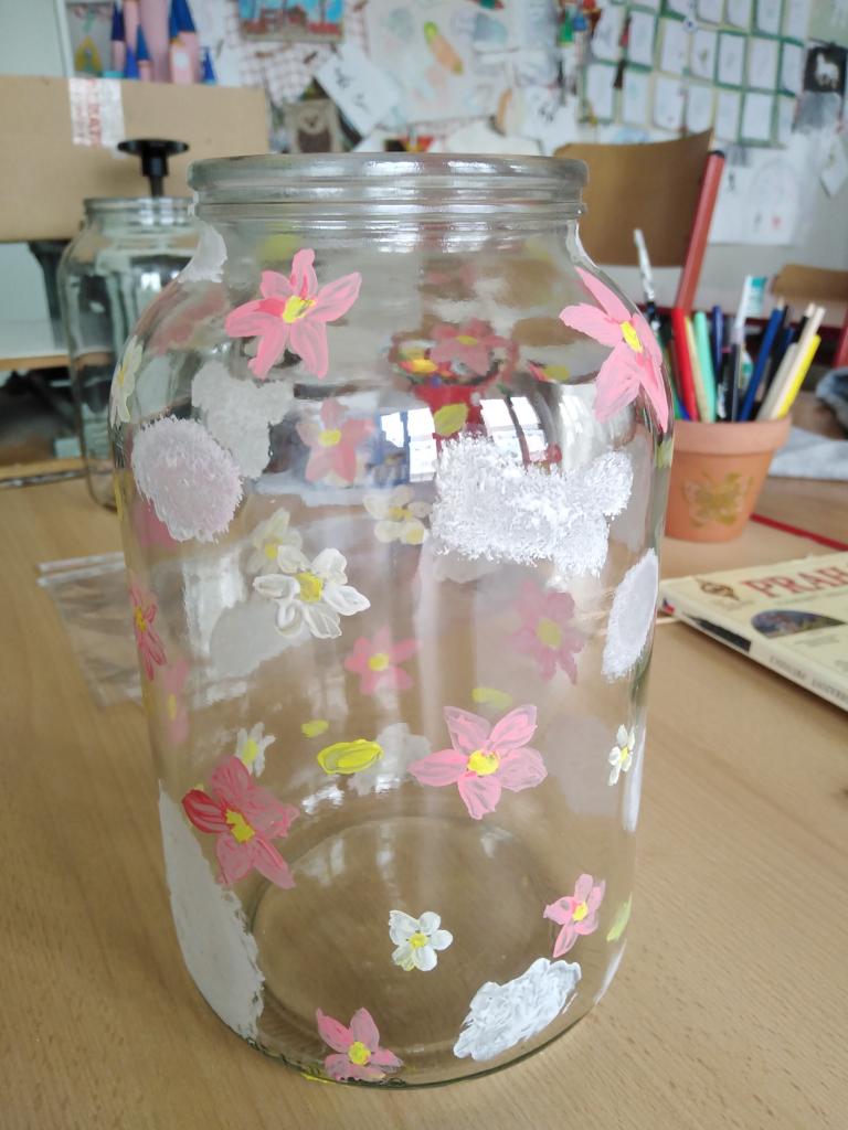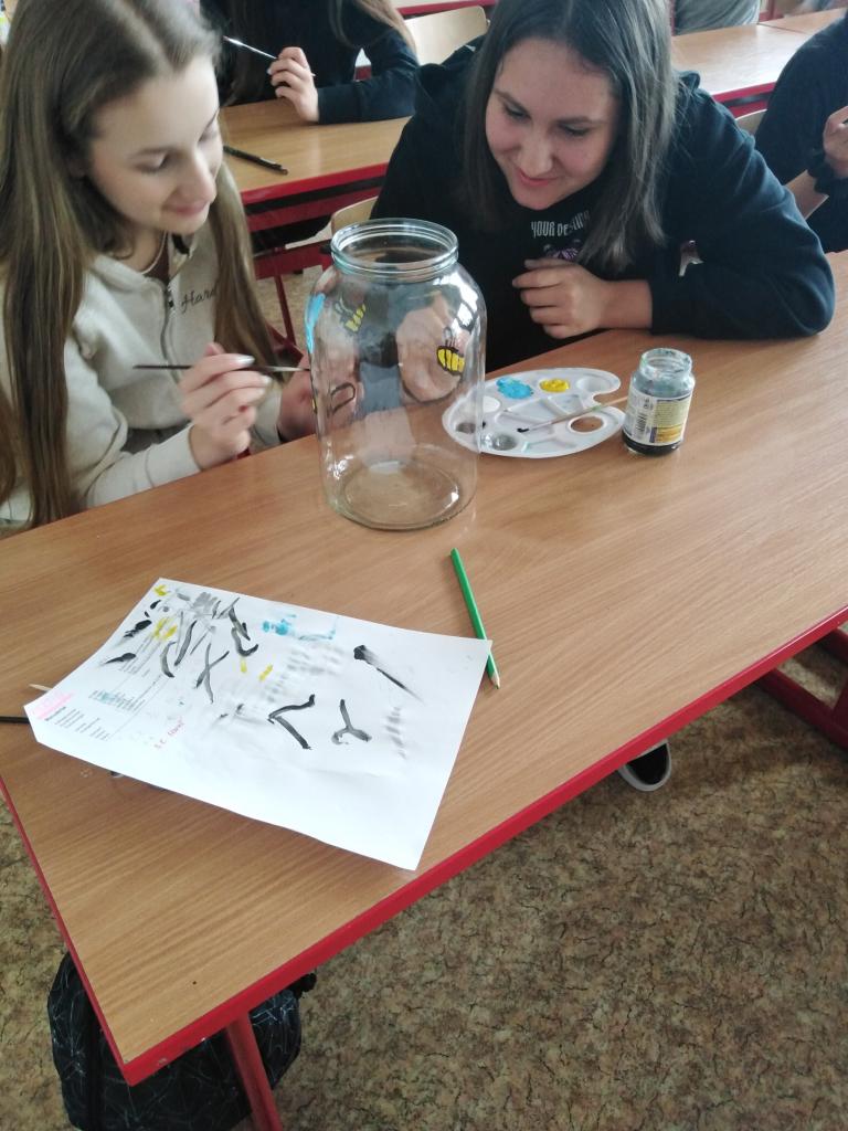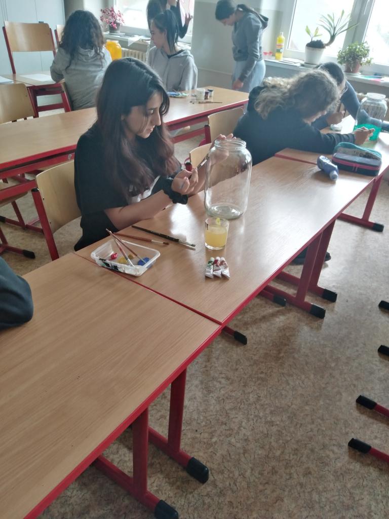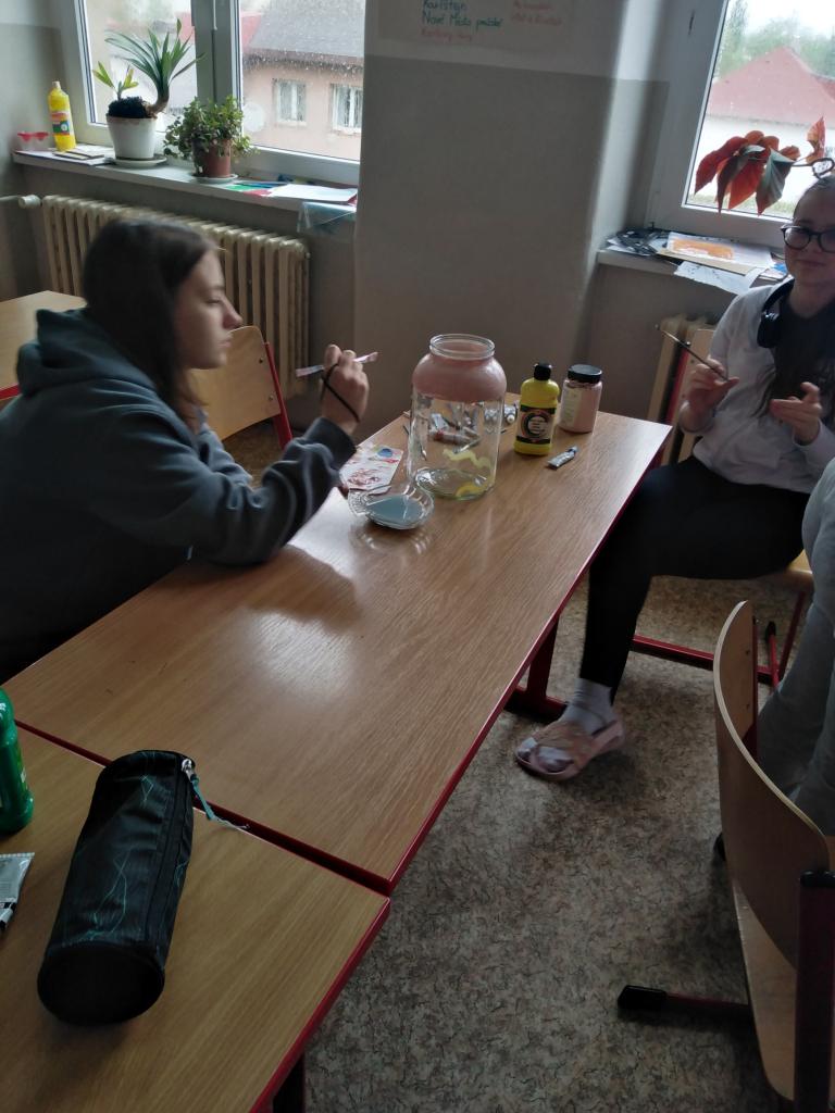Prší, prší jen se leje, sklenice se na nás směje...... Tak by se dala uvést dnešní hodina pracovních činností v osmé a devaté třídě. Děvčata se chopila temperových barev a sklenic a začala malovat. Před námi se začali objevovat slunéčka sedmitečná, včelky, vlčí máky, tulipány..........