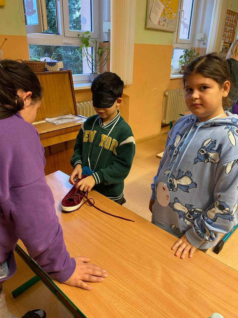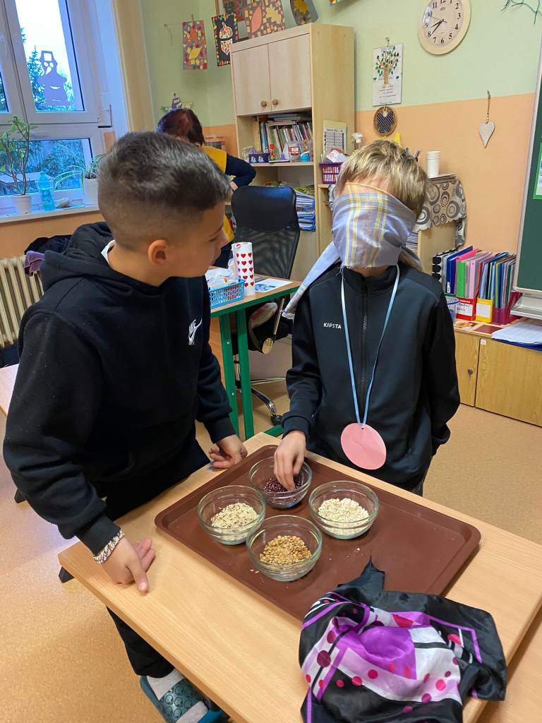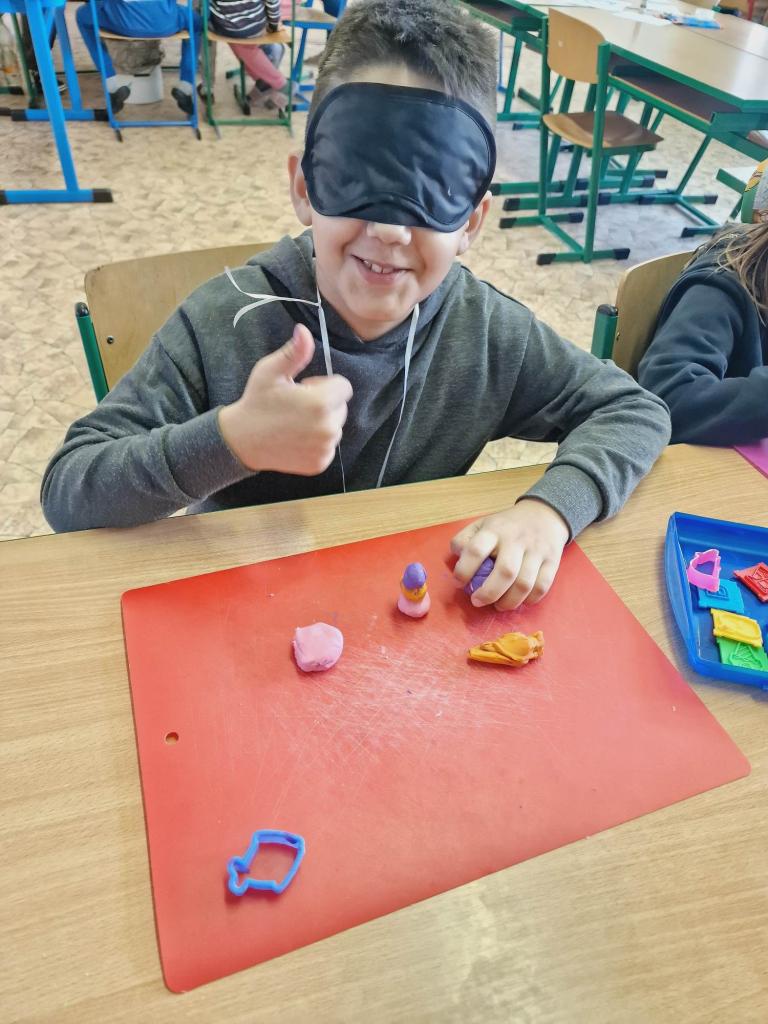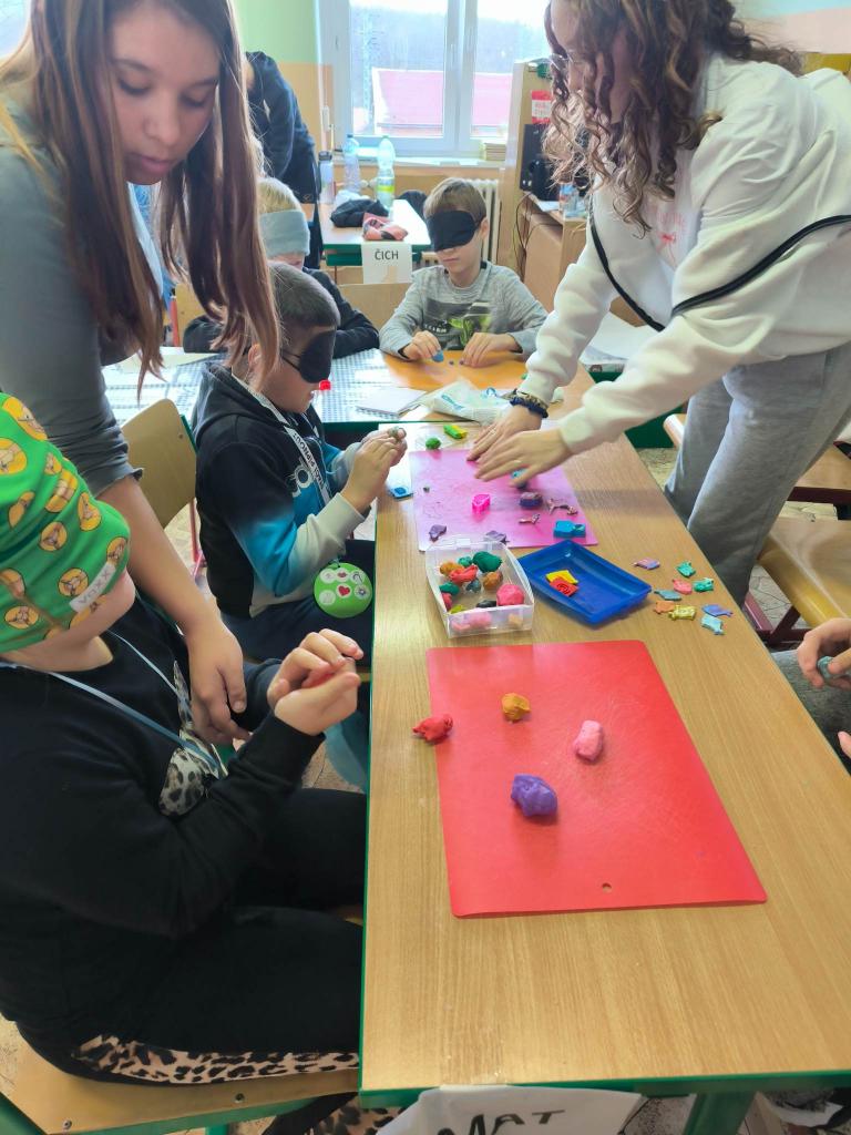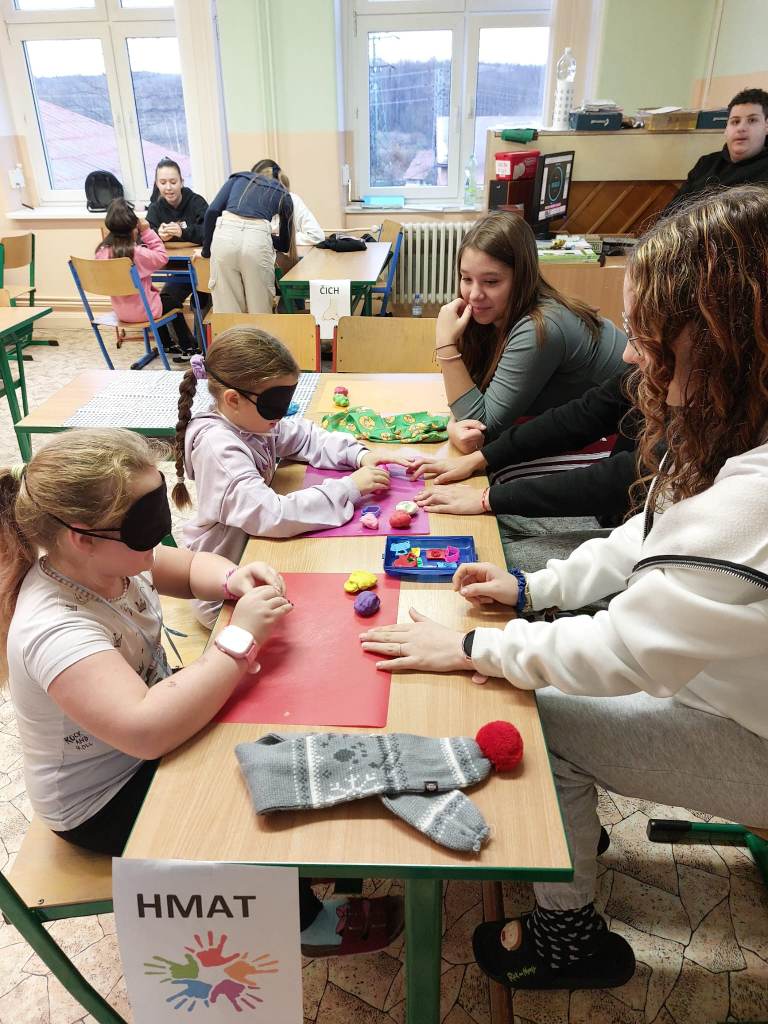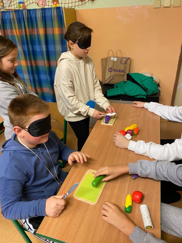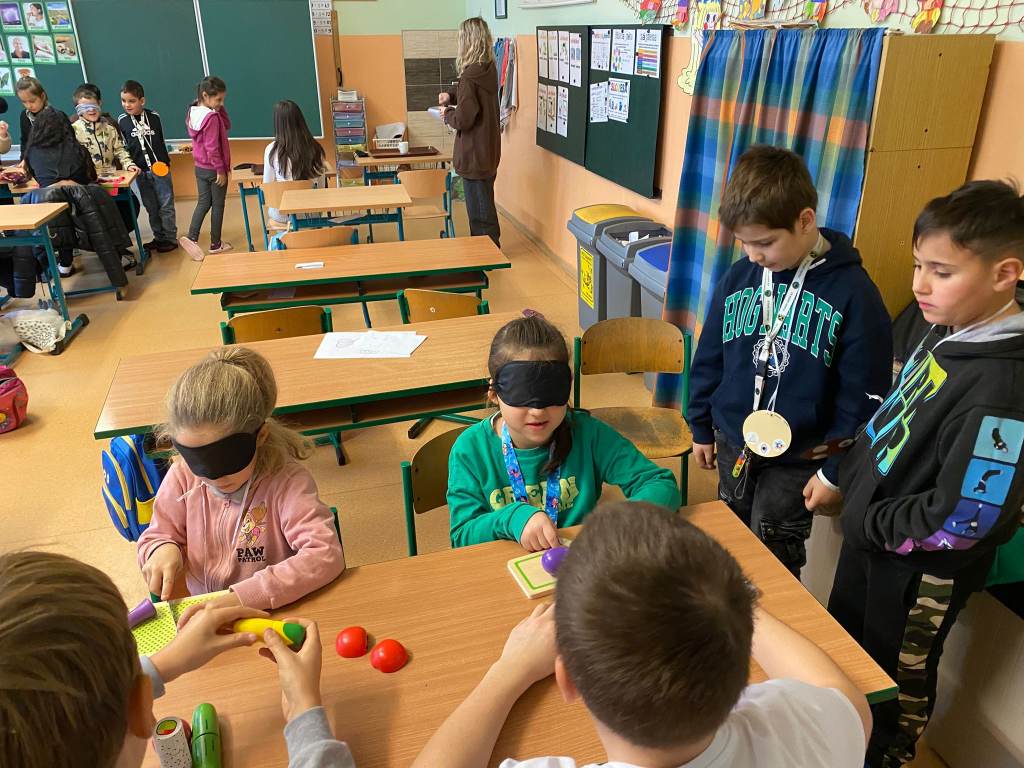 Nevidomí jednotlivě prožívají svět svým vlastním způsobem, využívají k tomu ostatní smysly. A právě v pátek 22. listopadu si žáci naší školy vyzkoušeli, jaké to je být nevidomým. Byl pro ně připraven program, kde si vyzkoušeli, jaké to je chodit "se slepeckou holí", jaké písmo mají nevidomí lidé, nebo například jak namalovat obrázek podle instrukcí poslepu, jak si připravit svačinu či jak nalít vodu bez zraku. Děti postupně procházely jednotlivými stanovišti, kde na ně čekaly hry a aktivity zaměřené na "osahání" prostředí všemi možnými smysly. Na stanovištích sbírali žáci symboly smyslů a lepili si je na své medaile.