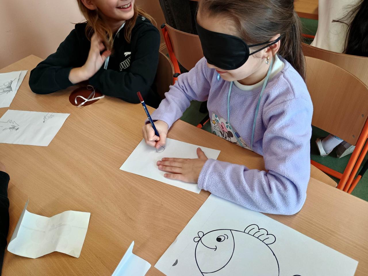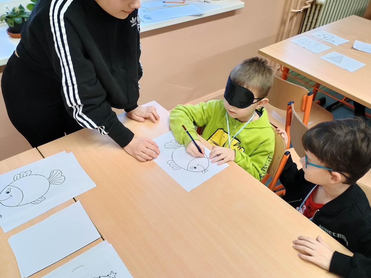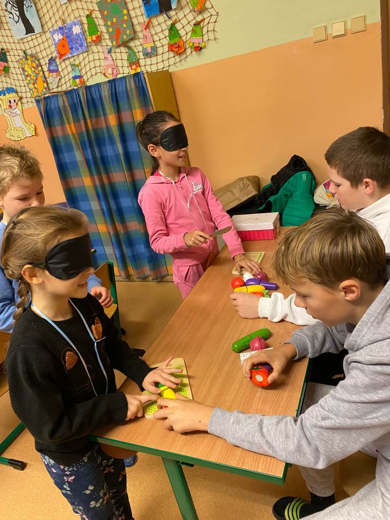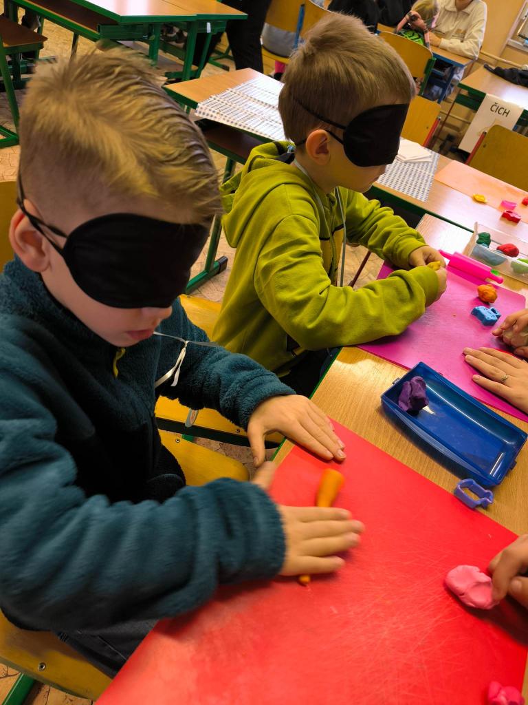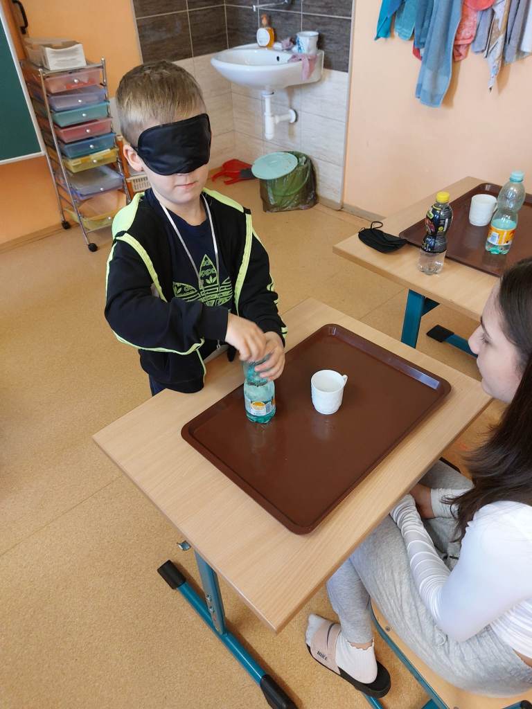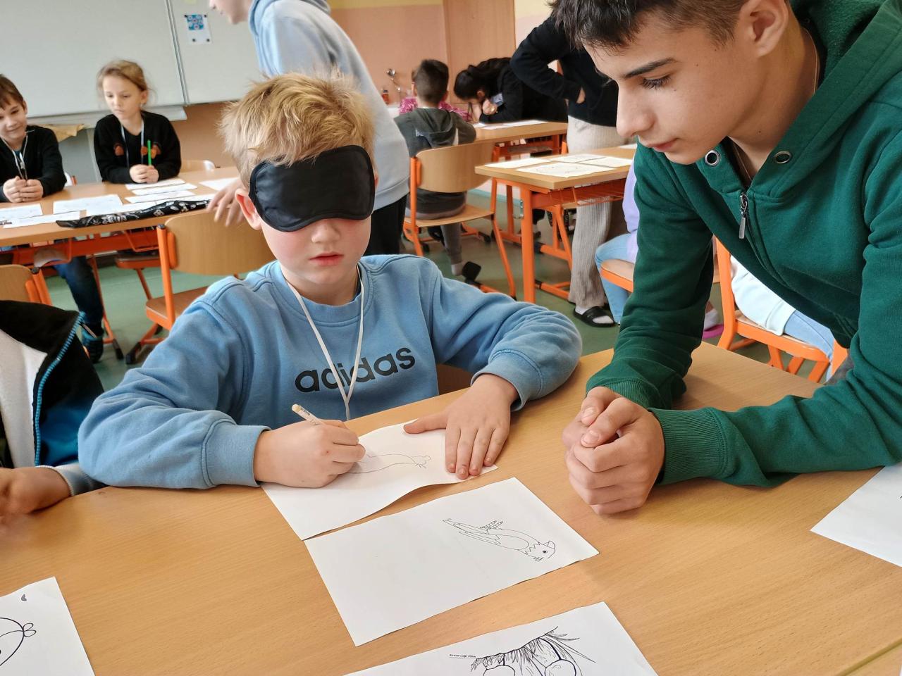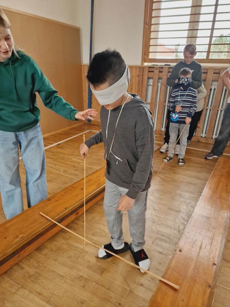 Nevidomí jednotlivě prožívají svět svým vlastním způsobem, využívají k tomu ostatní smysly. A právě v pátek 22. listopadu si žáci naší školy vyzkoušeli, jaké to je být nevidomým. Byl pro ně připraven program, kde si vyzkoušeli, jaké to je chodit "se slepeckou holí", jaké písmo mají nevidomí lidé, nebo například jak namalovat obrázek podle instrukcí poslepu, jak si připravit svačinu či jak nalít vodu bez zraku. Děti postupně procházely jednotlivými stanovišti, kde na ně čekaly hry a aktivity zaměřené na "osahání" prostředí všemi možnými smysly. Na stanovištích sbírali žáci symboly smyslů a lepili si je na své medaile.