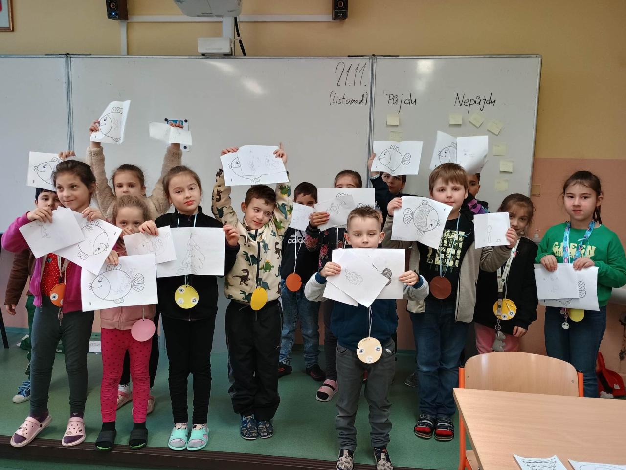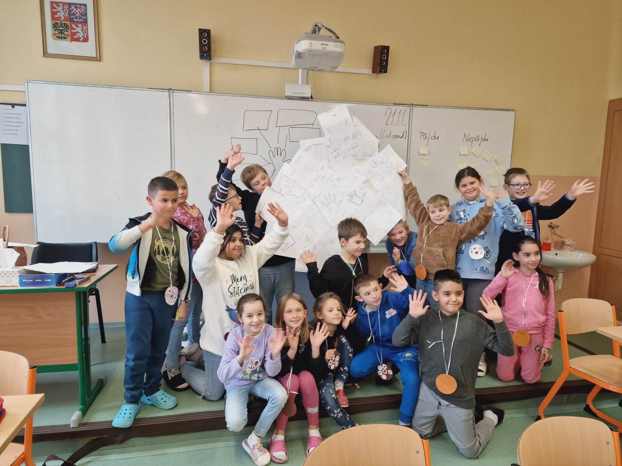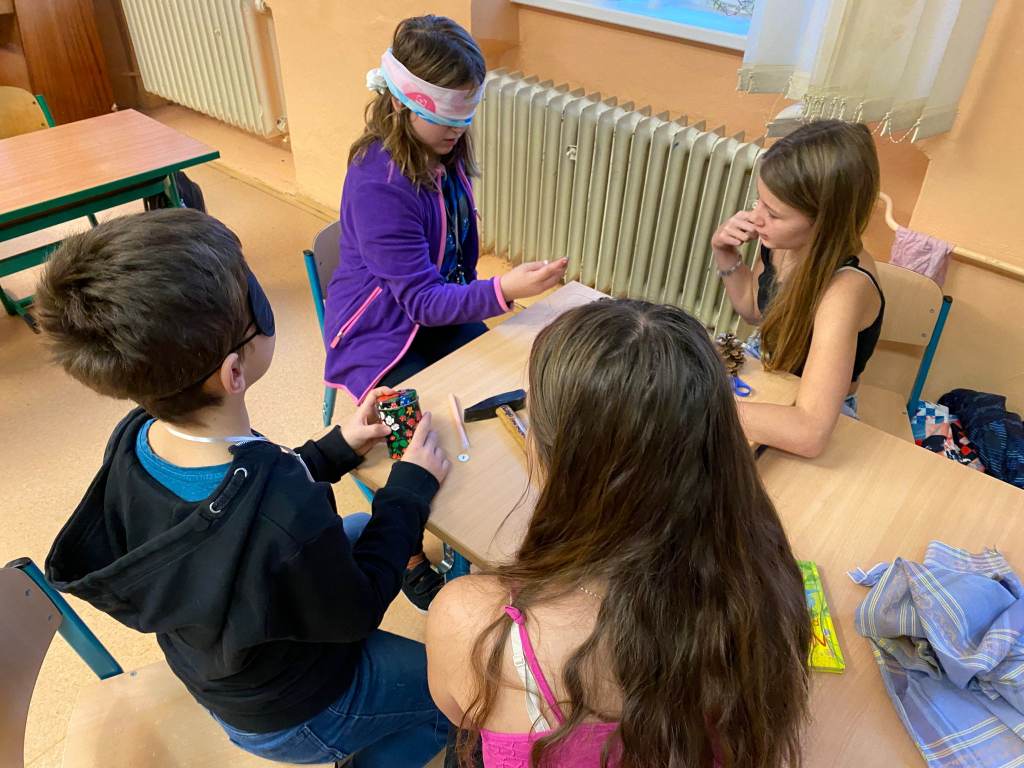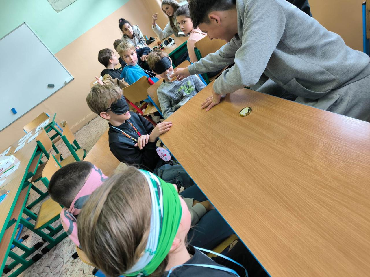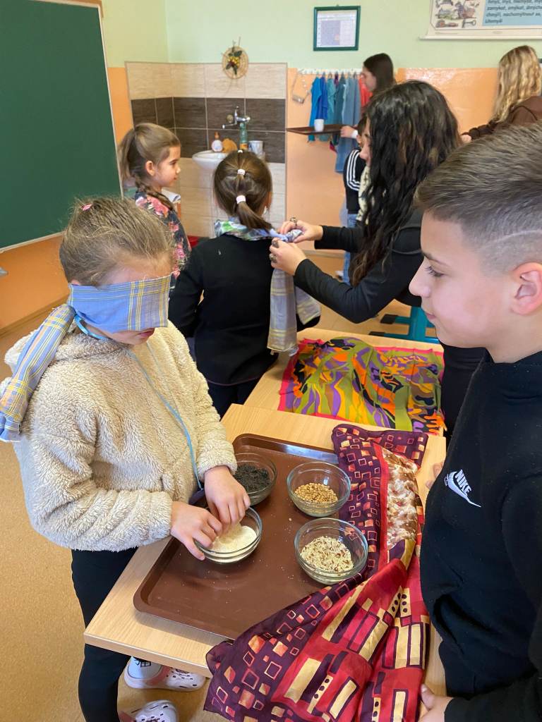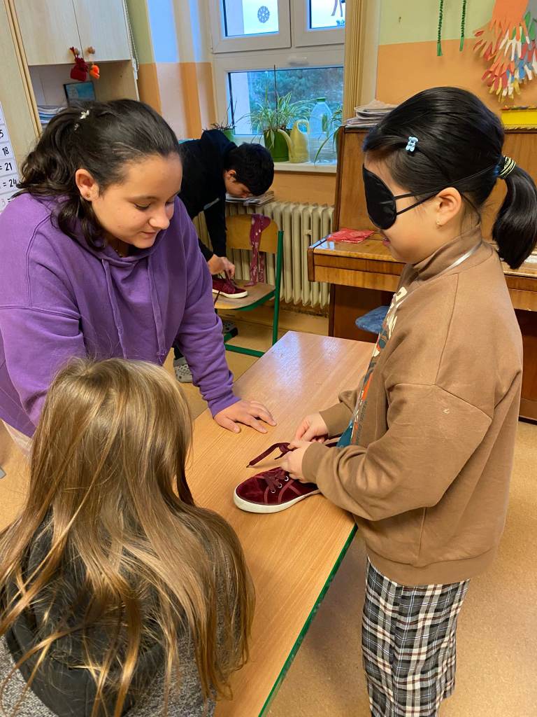 Nevidomí jednotlivě prožívají svět svým vlastním způsobem, využívají k tomu ostatní smysly. A právě v pátek 22. listopadu si žáci naší školy vyzkoušeli, jaké to je být nevidomým. Byl pro ně připraven program, kde si vyzkoušeli, jaké to je chodit "se slepeckou holí", jaké písmo mají nevidomí lidé, nebo například jak namalovat obrázek podle instrukcí poslepu, jak si připravit svačinu či jak nalít vodu bez zraku. Děti postupně procházely jednotlivými stanovišti, kde na ně čekaly hry a aktivity zaměřené na "osahání" prostředí všemi možnými smysly. Na stanovištích sbírali žáci symboly smyslů a lepili si je na své medaile.