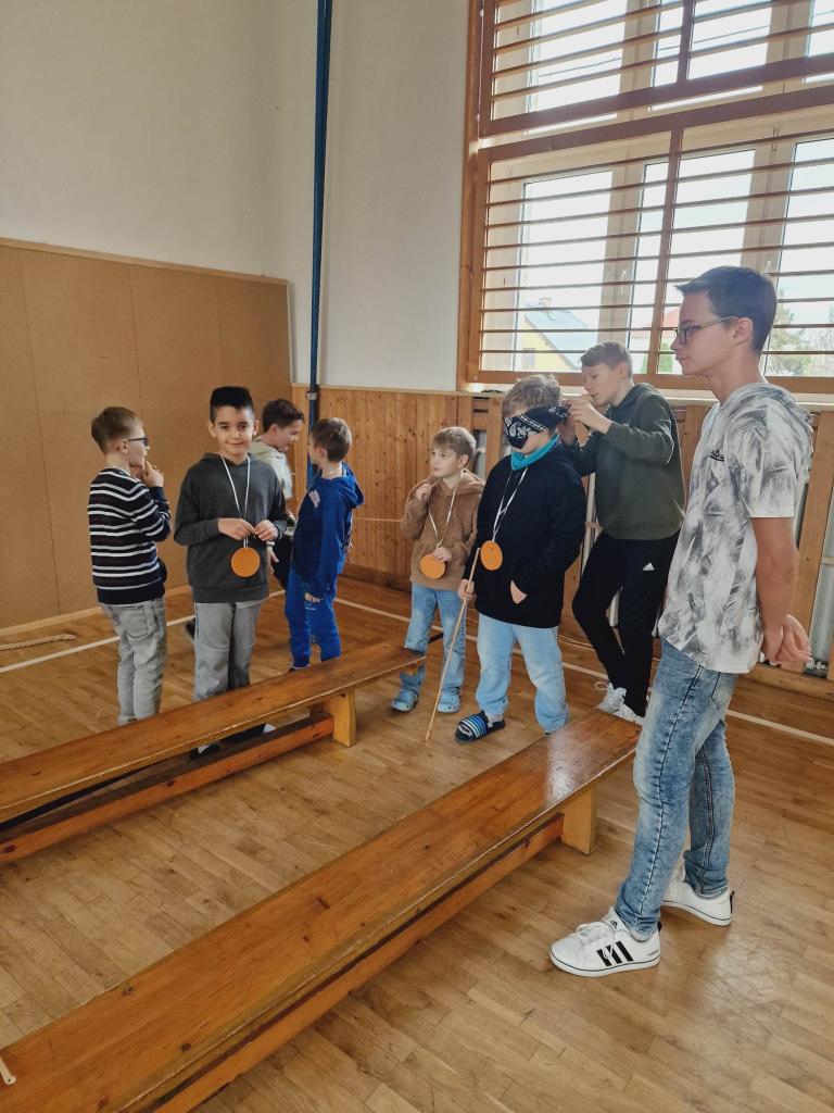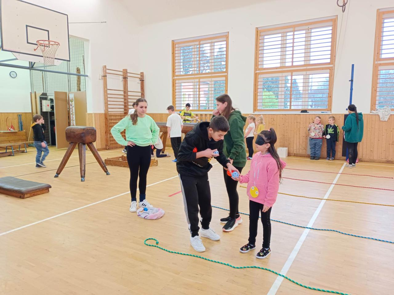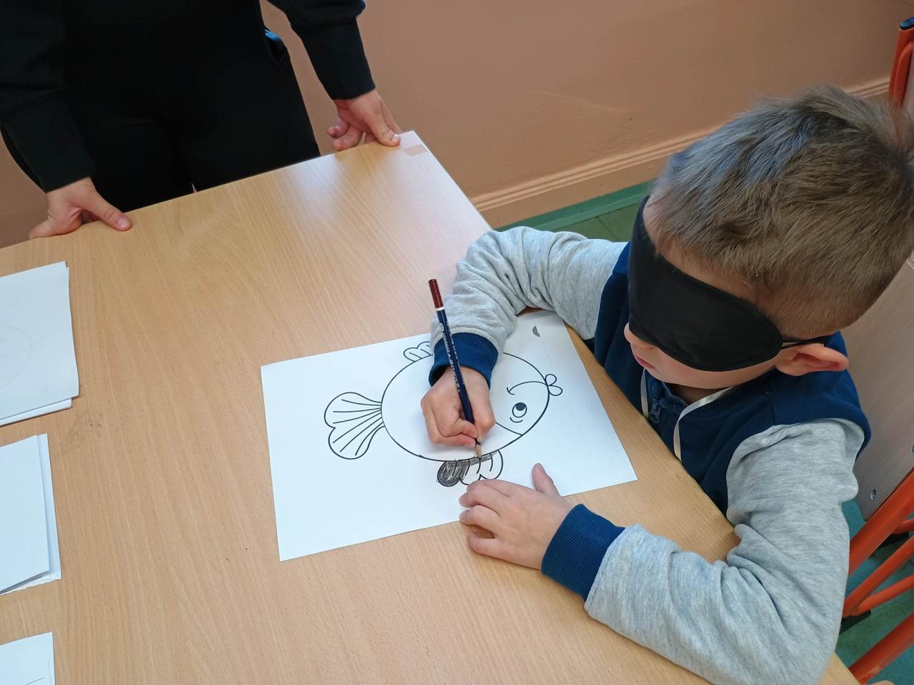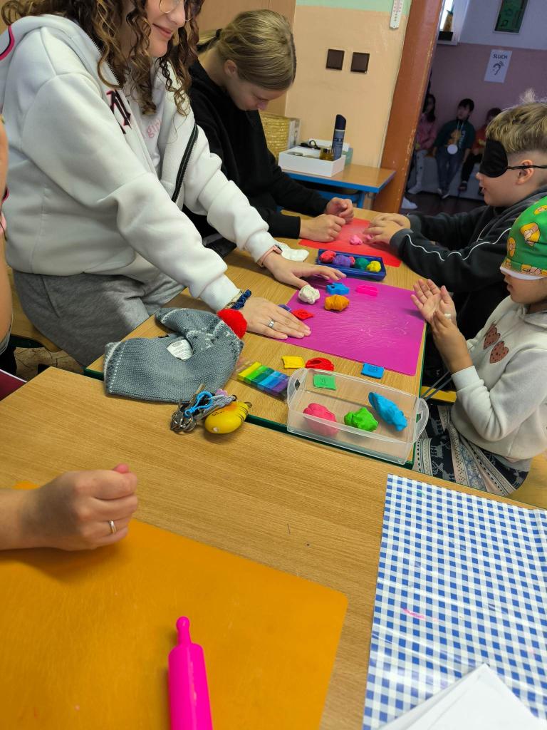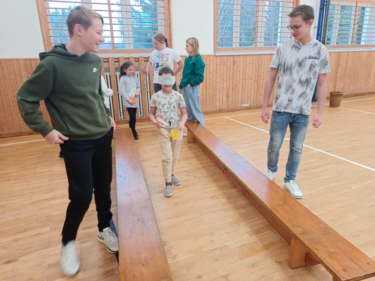 Nevidomí jednotlivě prožívají svět svým vlastním způsobem, využívají k tomu ostatní smysly. A právě v pátek 22. listopadu si žáci naší školy vyzkoušeli, jaké to je být nevidomým. Byl pro ně připraven program, kde si vyzkoušeli, jaké to je chodit "se slepeckou holí", jaké písmo mají nevidomí lidé, nebo například jak namalovat obrázek podle instrukcí poslepu, jak si připravit svačinu či jak nalít vodu bez zraku. Děti postupně procházely jednotlivými stanovišti, kde na ně čekaly hry a aktivity zaměřené na "osahání" prostředí všemi možnými smysly. Na stanovištích sbírali žáci symboly smyslů a lepili si je na své medaile.
