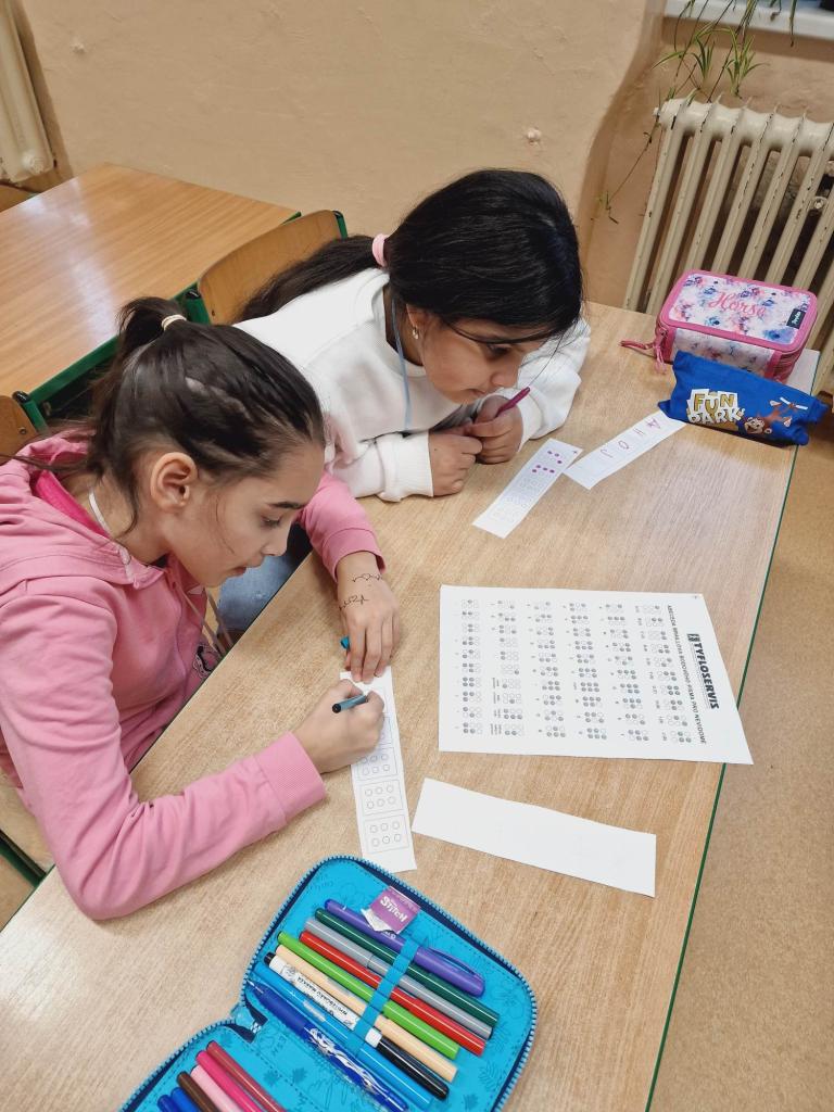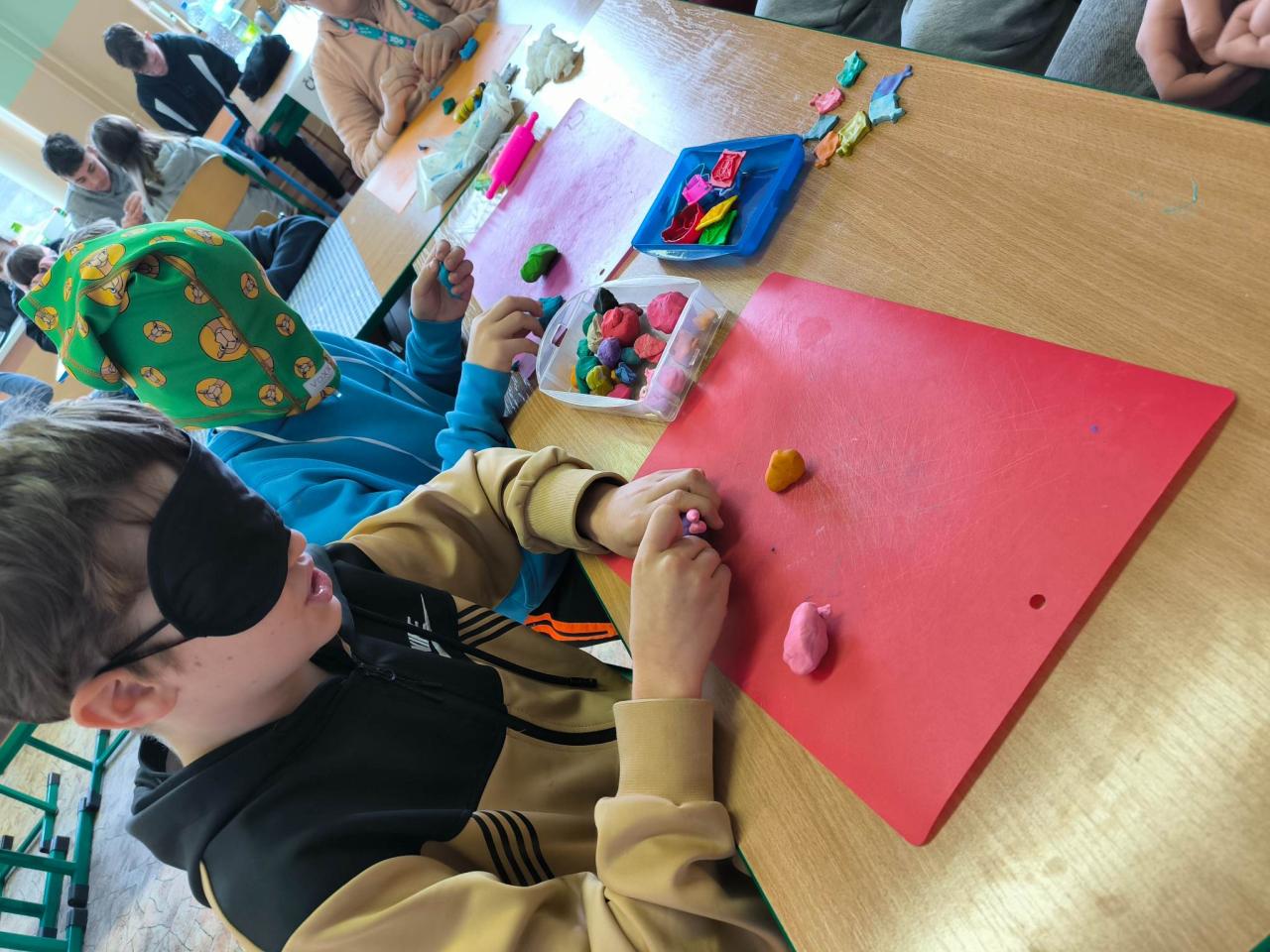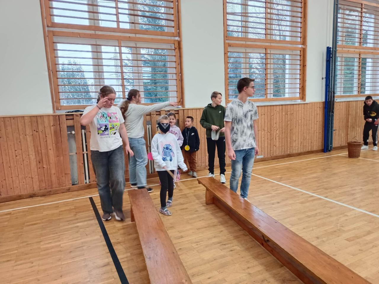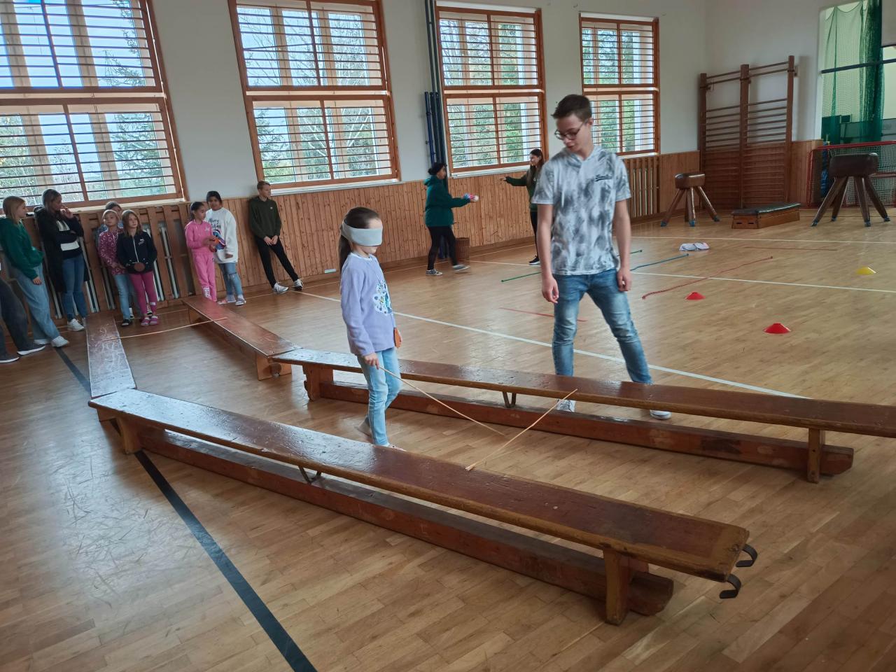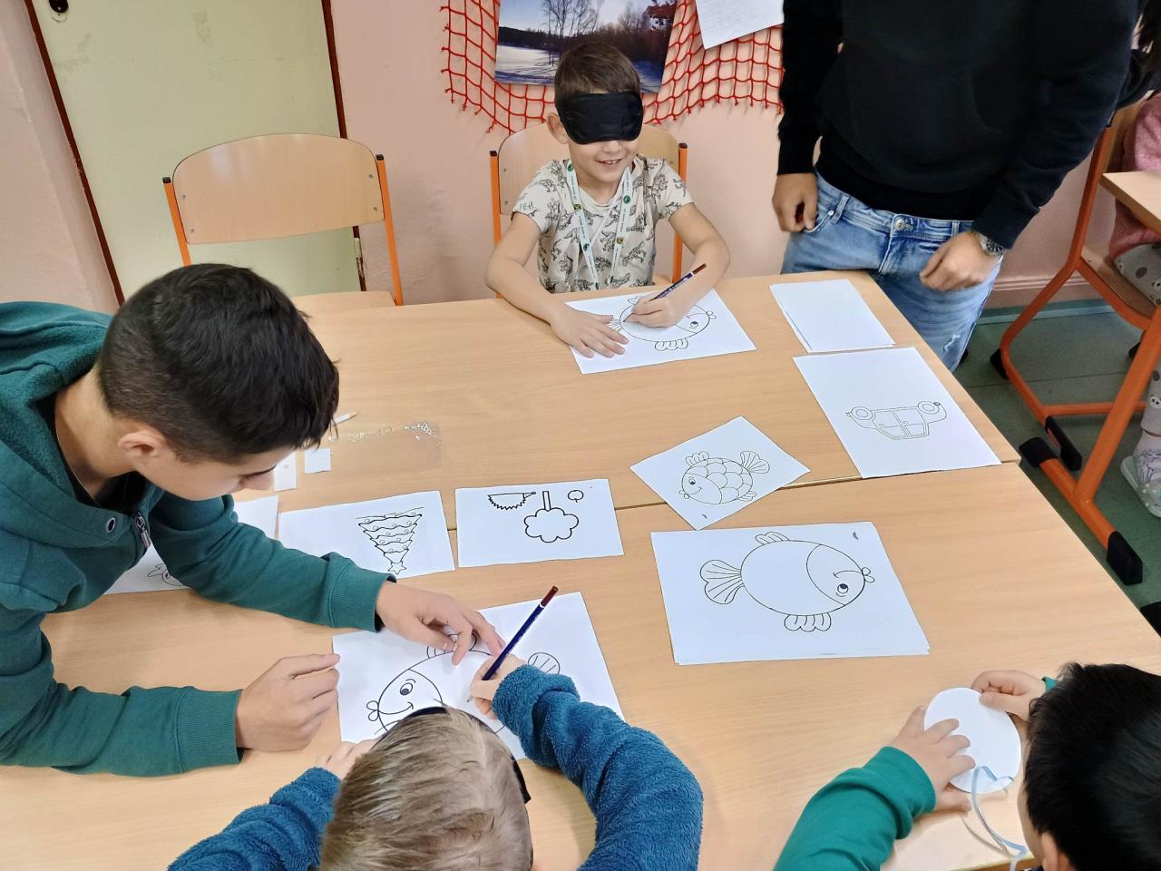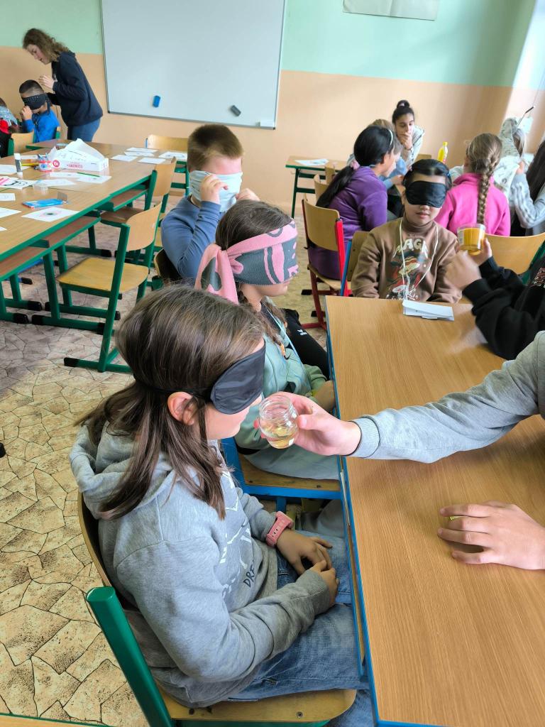 Nevidomí jednotlivě prožívají svět svým vlastním způsobem, využívají k tomu ostatní smysly. A právě v pátek 22. listopadu si žáci naší školy vyzkoušeli, jaké to je být nevidomým. Byl pro ně připraven program, kde si vyzkoušeli, jaké to je chodit "se slepeckou holí", jaké písmo mají nevidomí lidé, nebo například jak namalovat obrázek podle instrukcí poslepu, jak si připravit svačinu či jak nalít vodu bez zraku. Děti postupně procházely jednotlivými stanovišti, kde na ně čekaly hry a aktivity zaměřené na "osahání" prostředí všemi možnými smysly. Na stanovištích sbírali žáci symboly smyslů a lepili si je na své medaile.