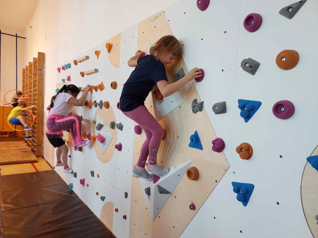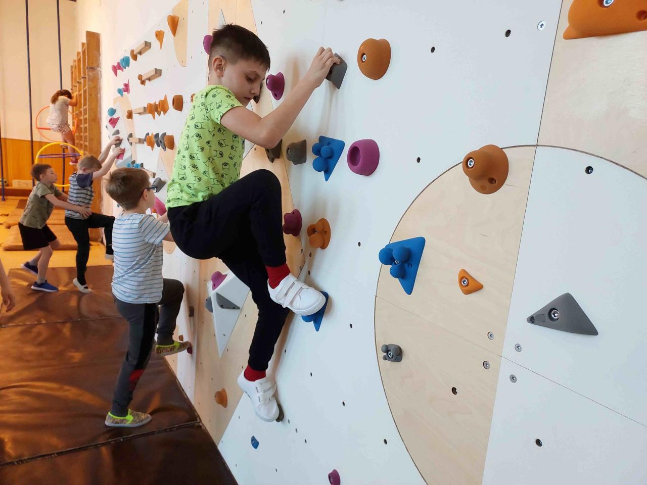 Před necelým týdnem nám do tělocvičny na 1. stupni přibyl nový prvek, který nikdo nemůže přehlédnout - lezecká stěna pro děti. Vedle tradičních žebřin tak přibyla další možnost rozvoje celkové obratnosti, posílení svalů celého těla i překonávání strachu z výšek. Stěna splňuje všechny předpoklady bezpečného lezení o čemž se dnes mohli přesvědčit druháci na hodině tělesné výchovy. Žáci na vlastní kůži zjistili, že takové lezení není úplně jednoduchá aktivita, udržet se na kolmé stěně už chce přece jenom trochu zkušeností a také odvahy. Všichni však nakonec zadaný úkol - přelézt horizontálně z bodu A do bodu B - zvládli. Různě barevné cesty, které jsou součástí stěny přijdou na řadu příště. Je to skvělá pomůcka, která si jistě najde mezi dětmi své příznivce a fanoušky.