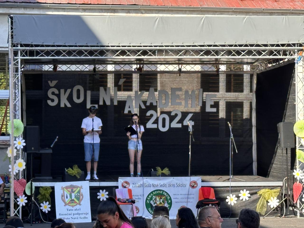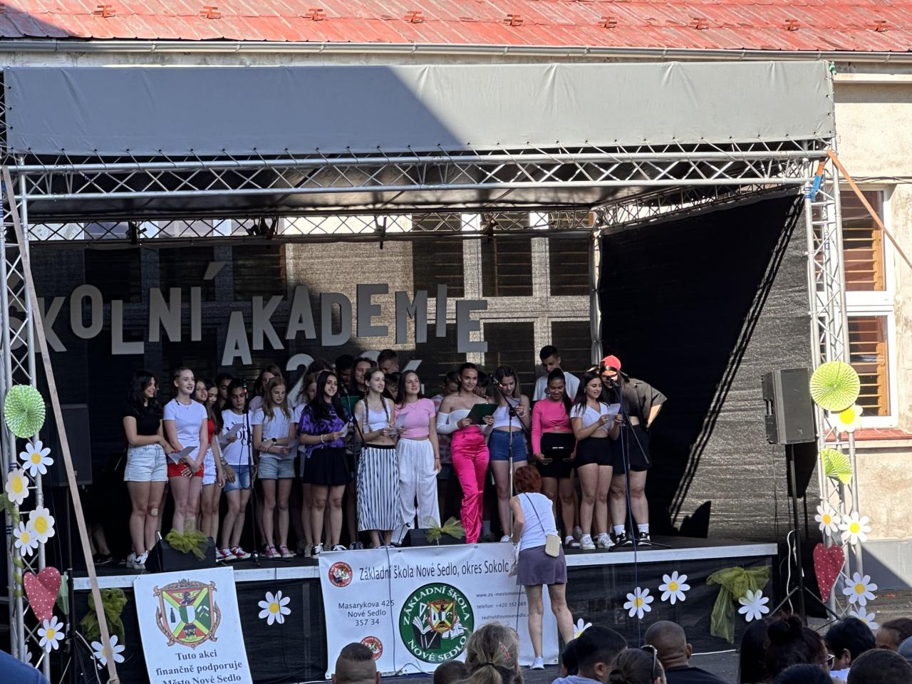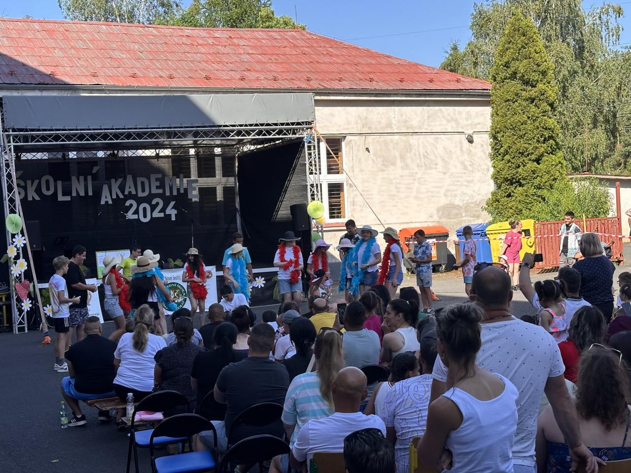 Téma naší akademie bylo jasné celý školní rok a to 90. výročí založení české školy v Novém Sedle. Zdatní a zábavní moderátoři Filip Slavíček, Štěpánka Ořechovská a Klára Fuchsová provedli diváky dlouholetou historií školy v Novém Sedle včetně dobových ukázek. Všechna vystoupení byla nápaditá, vtipná a šikovně zasazená do historické linky naší školy. Atmosféra akce měla obrovský náboj, vzduchem létaly hromady bankovek, na pódiu se střídal zpěv s hudbou a tancem, ba dokonce akvabely zaplavaly fantastickou sestavu, a to ve škole nemáme bazén. Vystoupení obohatily i paní učitelky z prvního stupně poměrně neznámou verzí pohádky o Popelce, která měla samozřejmě velký úspěch. Velké finále ovšem opanoval devátý ročník svým neotřelým uměleckým pásmem a závěrečnou korunovací učitelů na rozloučenou.