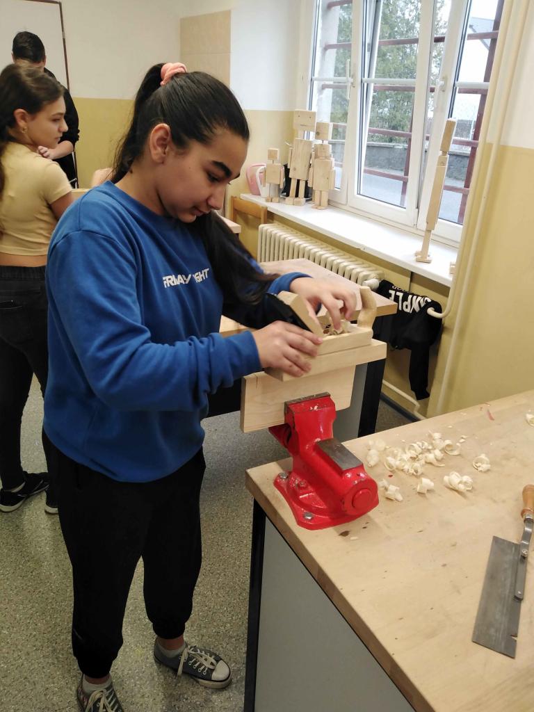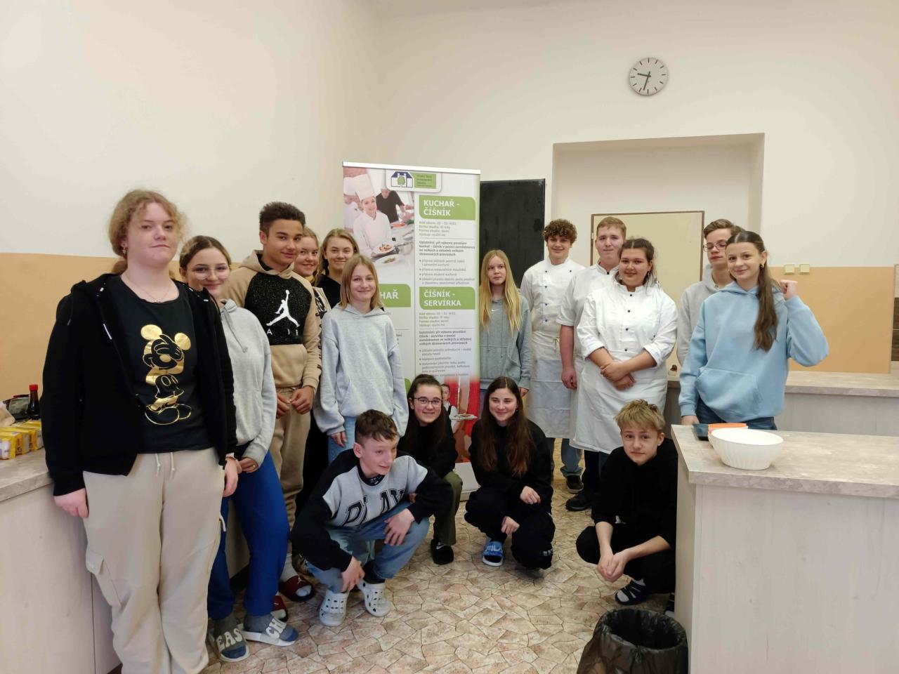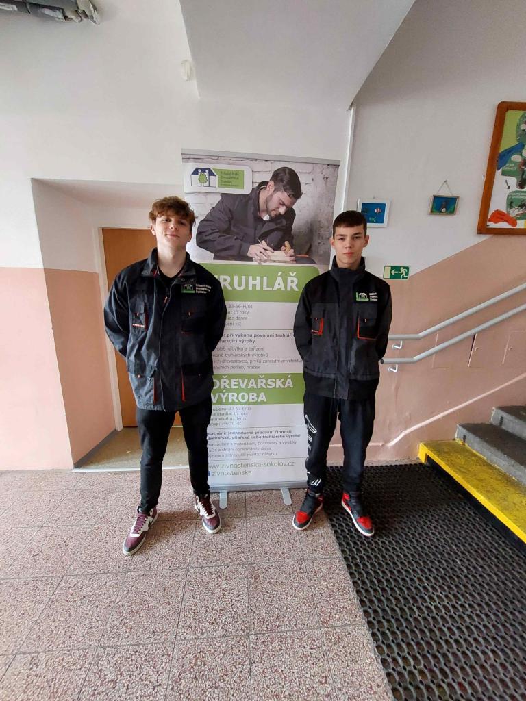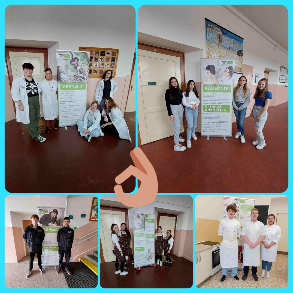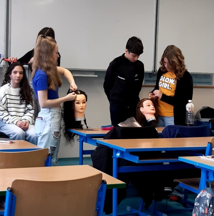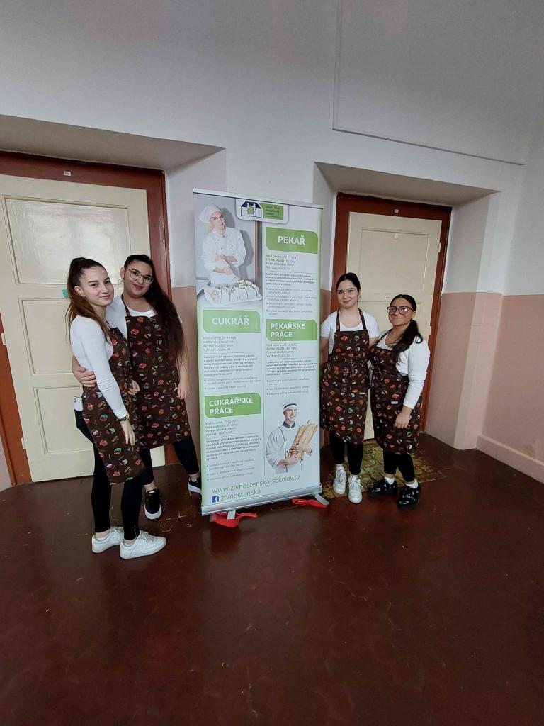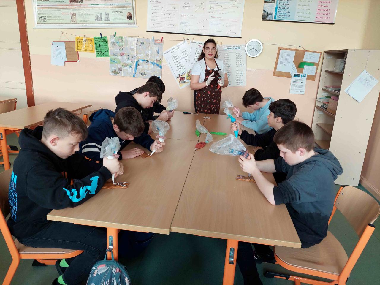 Stačilo uskutečnit nápad pozvat k nám do školy naše bývalé žáky, kteří v současné době navštěvují Střední školu živnostenskou v Sokolově, aby našim současným žákům, kteří se rozhodují nebo se v blízké budoucnosti budou rozhodovat o svých dalších krocích do života, v praktických ukázkách přiblížili učební obory, které živnostenská škola pro vycházející žáky nabízí. Byl to dobrý tah, neboť se k nám alespoň na jedno dopoledne měli možnost vrátit truhláři Jenda Hromada a Martin Šlapa, cukrářky Anička Doležalová, Adélka Plaňková, Petra Kostáková a Aneta Horváthová, aranžerka Nikola Orešková, kadeřnice Kristýna Koucká a Karolína Havlíčková. Spolu s nimi k nám zavítali ještě další jejich spolužáci coby kuchaři, aranžéři i kadeřnice. Naši žáci z celého druhého stupně tak měli možnost projít si vším, co jim bylo nabídnuto - vše si prakticky vyzkoušet, osahat, na všechno, co koho zajímalo se zeptat. Všichni středoškoláci byli ochotní, vstřícní, trpěliví a hlavně šikovní. Truhláři předvedli základní techniky řezů a opracování dřeva, kadeřnice pletení copánků, natáčení pramenů, žehlení vlasů, kuchaři zase ukázali žákům techniky krájení a práce s noži a přípravu jednoduchých pokrmů studené kuchyně, cukrářky si připravily zdobení perníčků a přípravu čokoládových šablon a aranžéři představili práci s grafickým tabletem, využití plotru Brother a raznice na designové placky. Bylo na co se dívat.