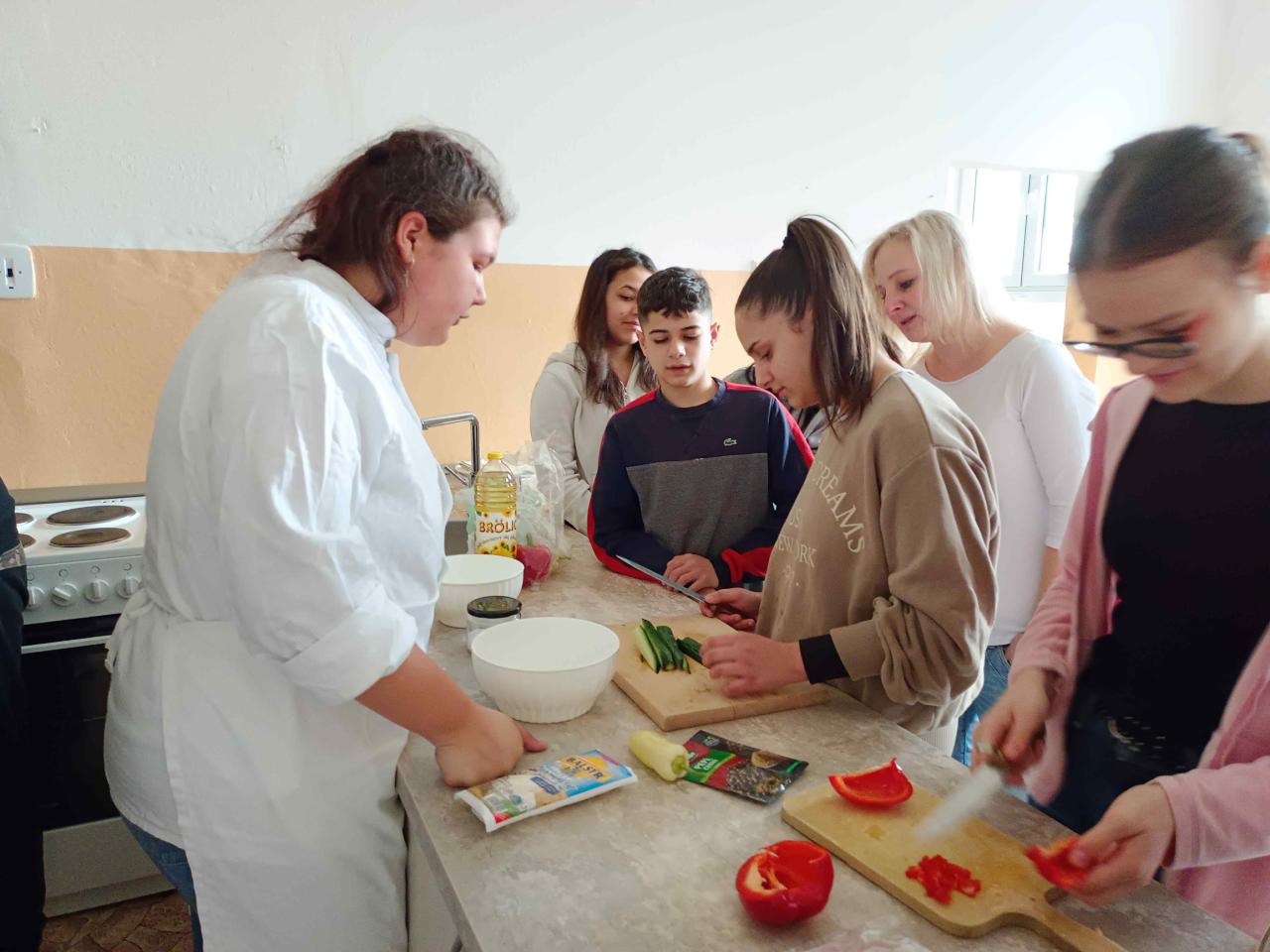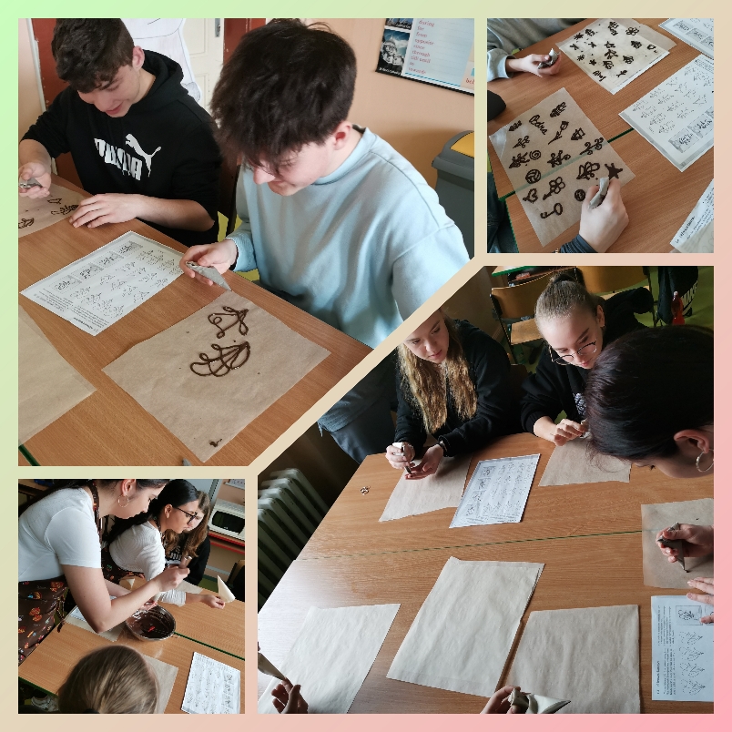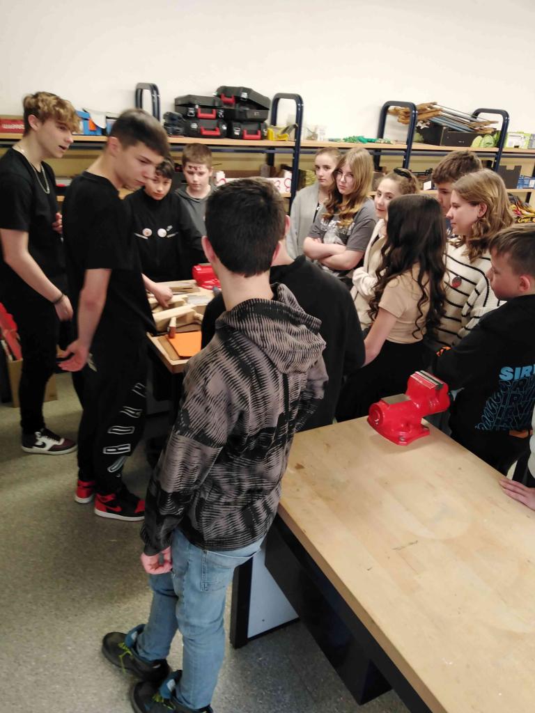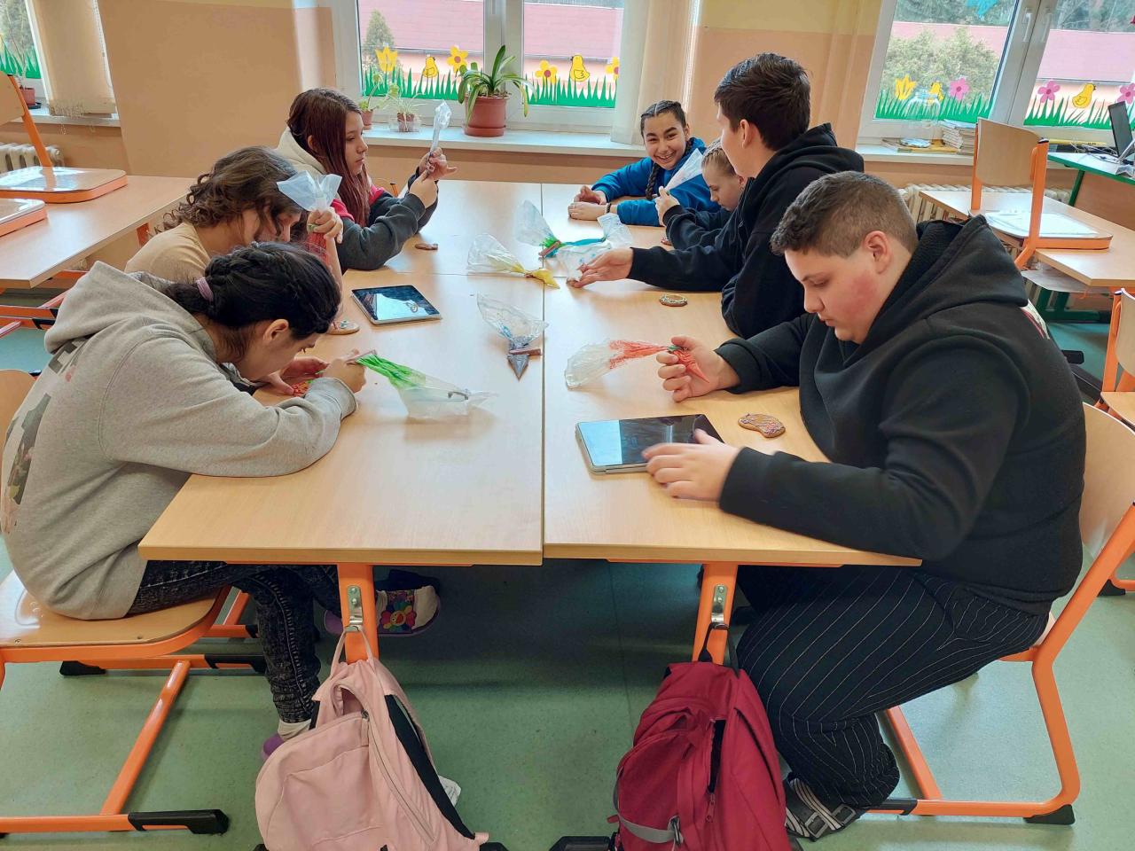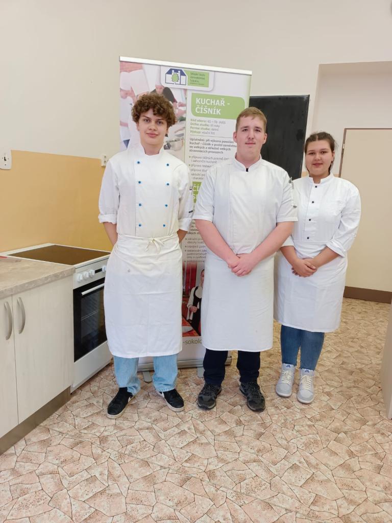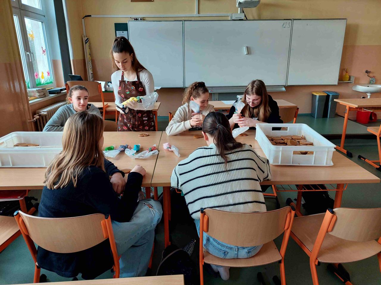 Stačilo uskutečnit nápad pozvat k nám do školy naše bývalé žáky, kteří v současné době navštěvují Střední školu živnostenskou v Sokolově, aby našim současným žákům, kteří se rozhodují nebo se v blízké budoucnosti budou rozhodovat o svých dalších krocích do života, v praktických ukázkách přiblížili učební obory, které živnostenská škola pro vycházející žáky nabízí. Byl to dobrý tah, neboť se k nám alespoň na jedno dopoledne měli možnost vrátit truhláři Jenda Hromada a Martin Šlapa, cukrářky Anička Doležalová, Adélka Plaňková, Petra Kostáková a Aneta Horváthová, aranžerka Nikola Orešková, kadeřnice Kristýna Koucká a Karolína Havlíčková. Spolu s nimi k nám zavítali ještě další jejich spolužáci coby kuchaři, aranžéři i kadeřnice. Naši žáci z celého druhého stupně tak měli možnost projít si vším, co jim bylo nabídnuto - vše si prakticky vyzkoušet, osahat, na všechno, co koho zajímalo se zeptat. Všichni středoškoláci byli ochotní, vstřícní, trpěliví a hlavně šikovní. Truhláři předvedli základní techniky řezů a opracování dřeva, kadeřnice pletení copánků, natáčení pramenů, žehlení vlasů, kuchaři zase ukázali žákům techniky krájení a práce s noži a přípravu jednoduchých pokrmů studené kuchyně, cukrářky si připravily zdobení perníčků a přípravu čokoládových šablon a aranžéři představili práci s grafickým tabletem, využití plotru Brother a raznice na designové placky. Bylo na co se dívat.