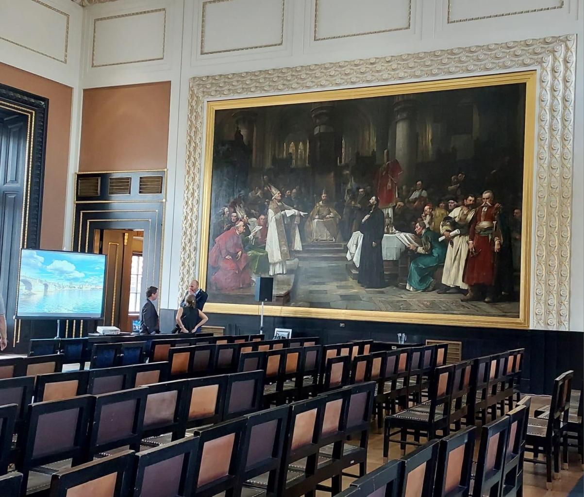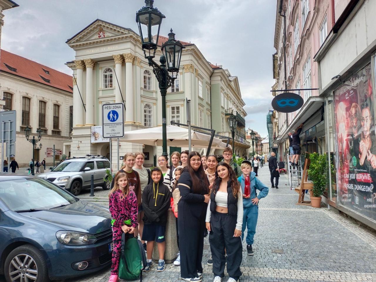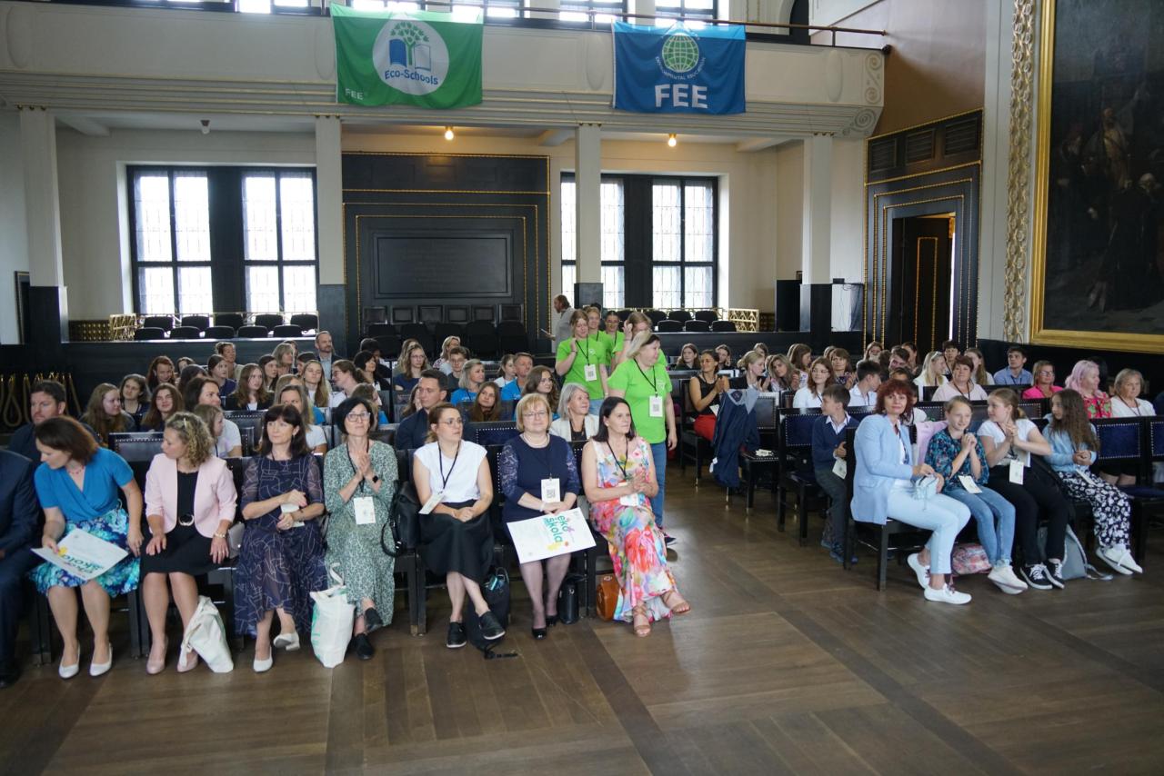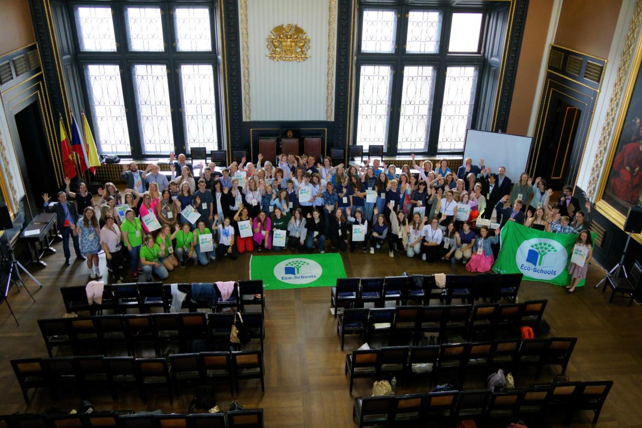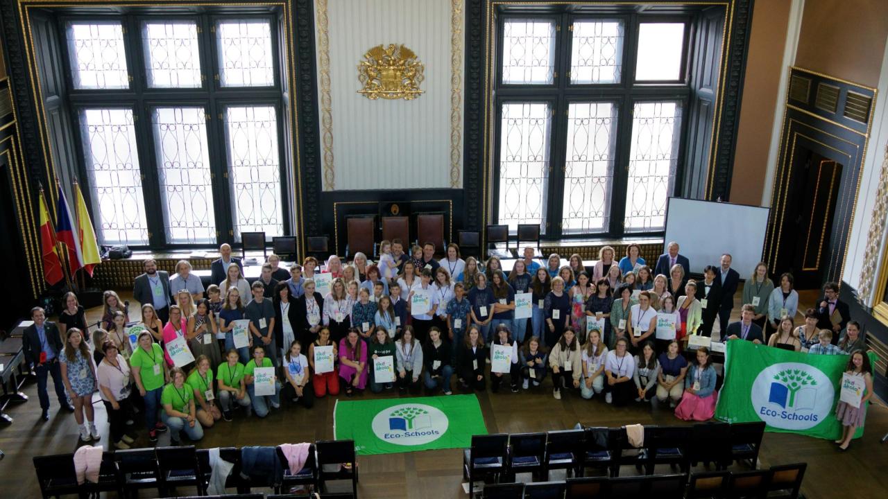 V 7:35 jsme vyrazili autobusem do Prahy, kde se předávání konalo. Čtyři zástupci ekotýmu (Klára, Viky, Tereza a Eliška) s paní učitelkou Strejcovou se vydaly na Staroměstskou radnici. Zbytek ekotýmu šel s paní učitelkou Žiškovou do muzea voskových figurín a následně do Mc´Donaldu na oběd. Mezitím byla děvčata usazena do Brožíkova sálu a čekala na zahájení. Jako první měli proslov zástupci nadace Tereza a zástupkyně OSN a bylo zhlédnuto video s projeven ministra životního prostředí pana Hladíka. Poté začalo samotné předávání. Zúčastnilo se mnoho škol od mateřských, základních až po střední. Někteří svoje tituly obhajovali, někteří (jako například my), jsme titul získali poprvé. Dostali jsme certifikát, vývěsku na školu, zelenou vlajku a tašku s dárky. Moderátor nám poté položil otázku: „Kdybych byl u vás ve škole, kam byste mě vzali?“ Naše mluvčí, Klára Fuchsová, odpověděla: „Určitě na naši školní zahradu, kde máme nové vyvýšené záhony a místo sedaček máme špalky z různých stromů.“ Po ukončení se k děvčatům připojil zbytek ekotýmu s paní učitelkou Žiškovou a vydali jsme se do sálu architektů, kde probíhal další program zakončený slavnostním přípitkem na oslavu třiceti let ekoškoly.