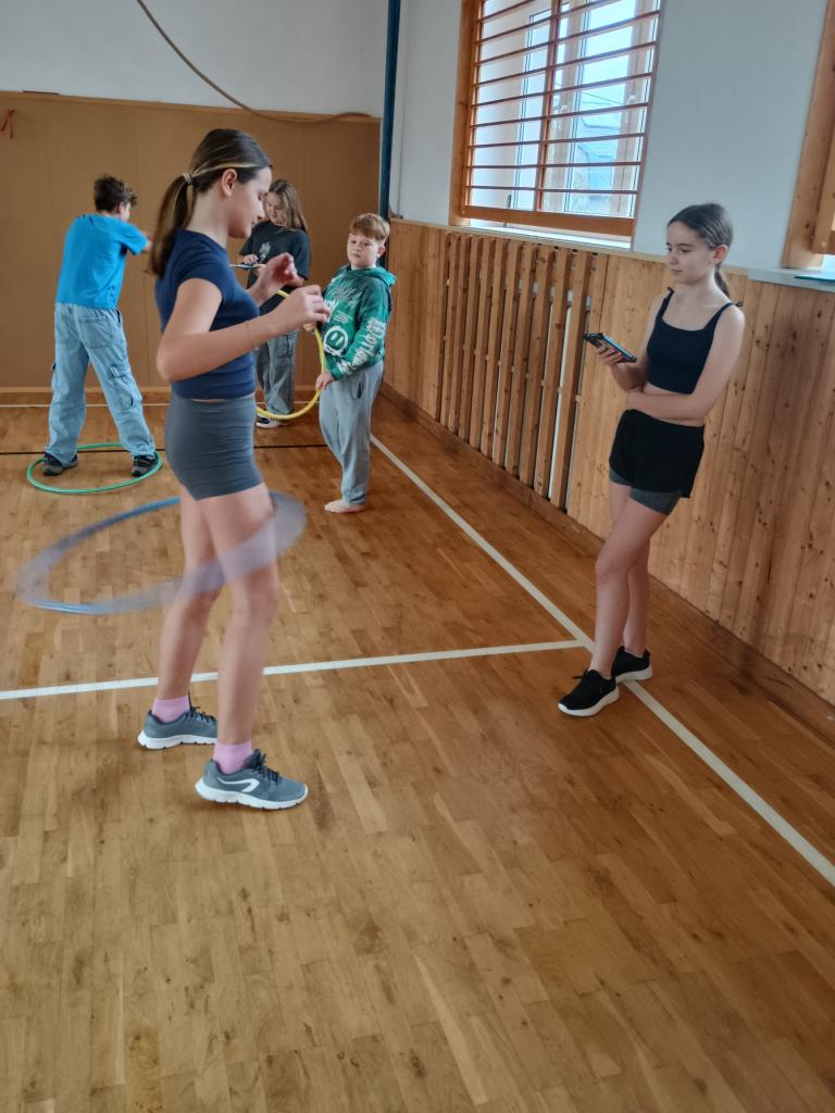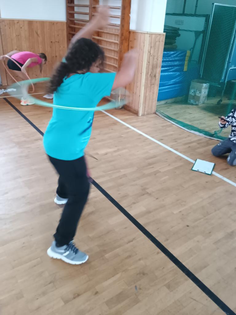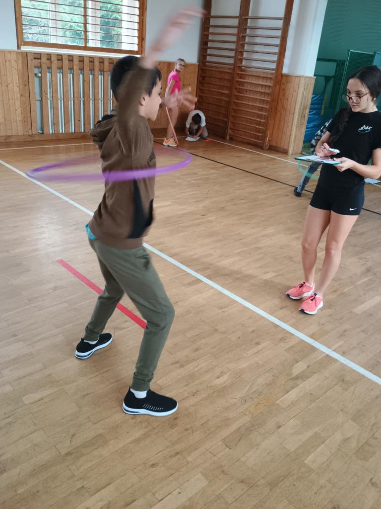 V každé kategorii se žáci snažili udržet obruč v pohybu co nejdéle. Atmosféra byla skvělá, soutěžící se vzájemně povzbuzovali a fandila i početná divácká podpora.