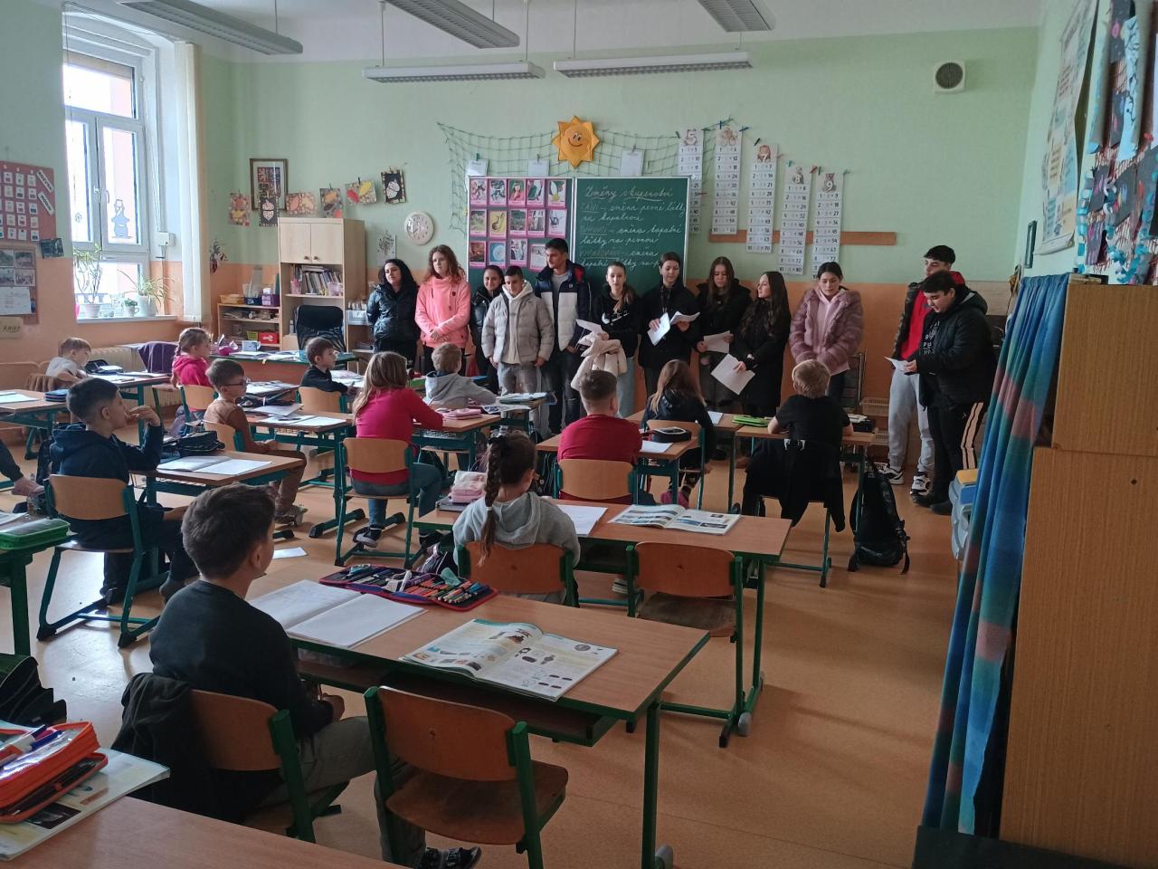 V okolí školy - kolem 1.stupně i na zahradě kolem 2. stupně - bylo připraveno 11 úkolů, 11 otázek. Stačilo vybrat správnou odpověď ze tří možností a napsat písmenko k příslušnému číslu otázky a vyluštit tajenku. Výherce už známe: