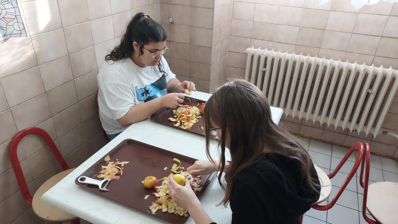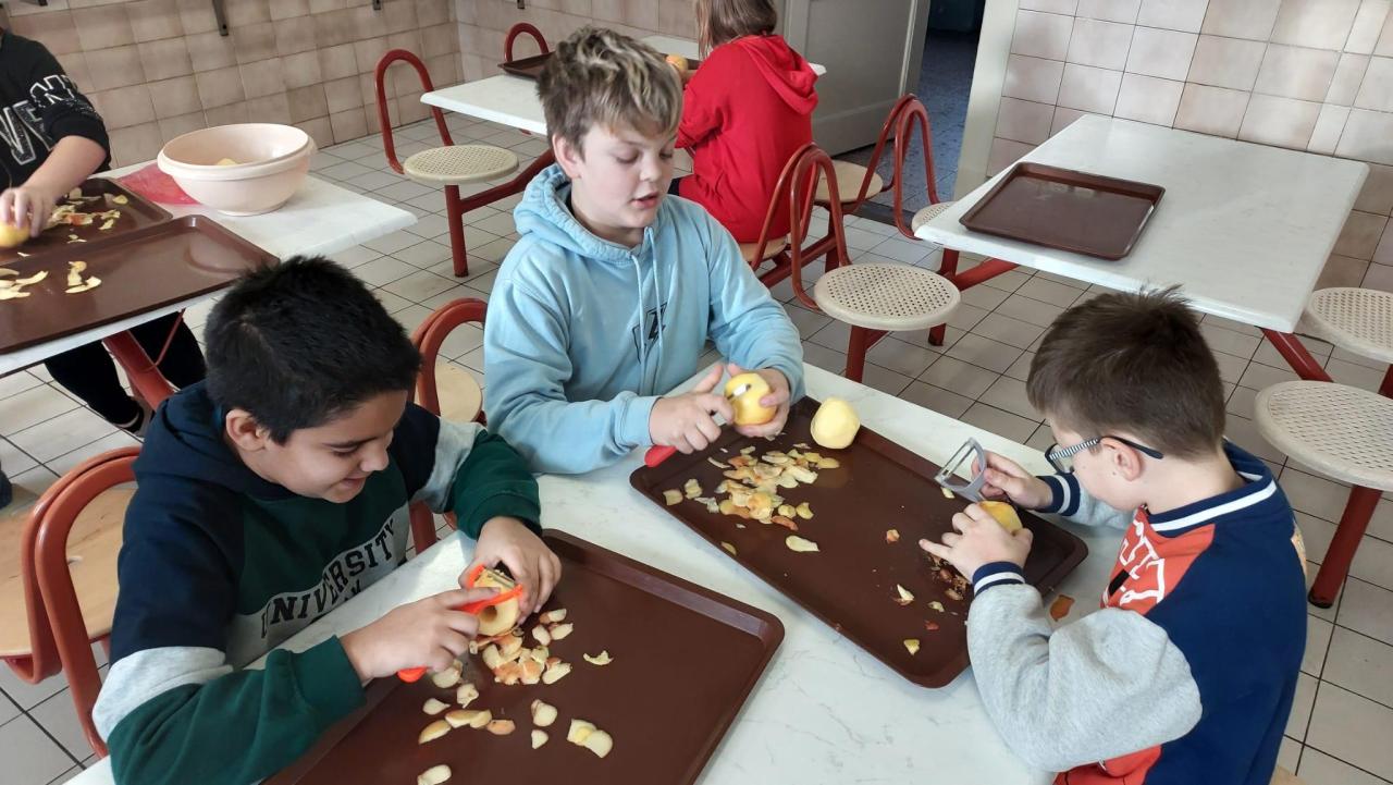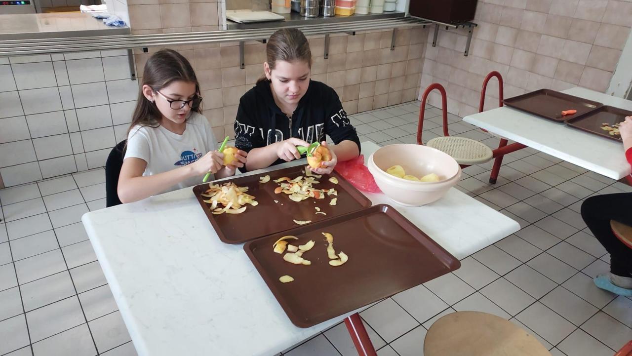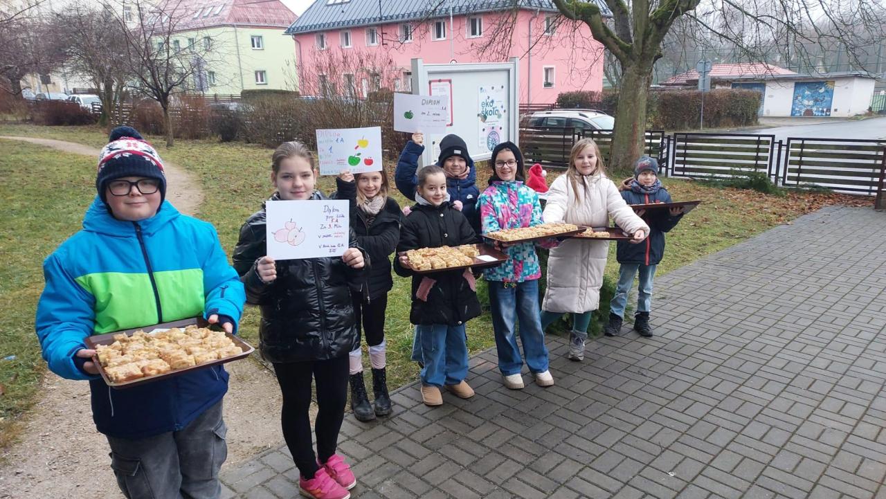 Děkujeme všem žákům za jejich nadšení, poctivost a chuť se zapojit. Jako poděkování všem soutěžícím upekly paní kuchařky jablečný koláč, na který jablka loupali členové Ekotýmu.