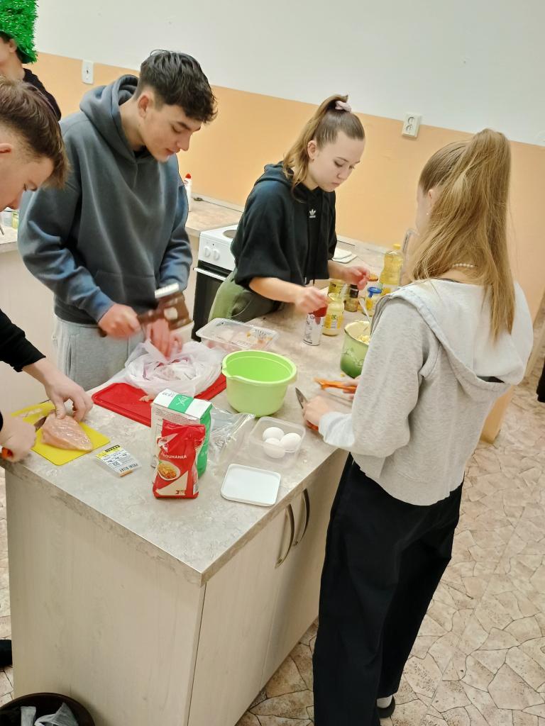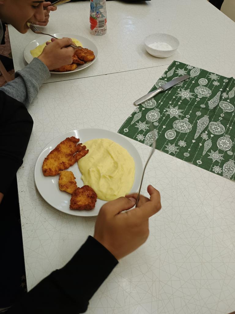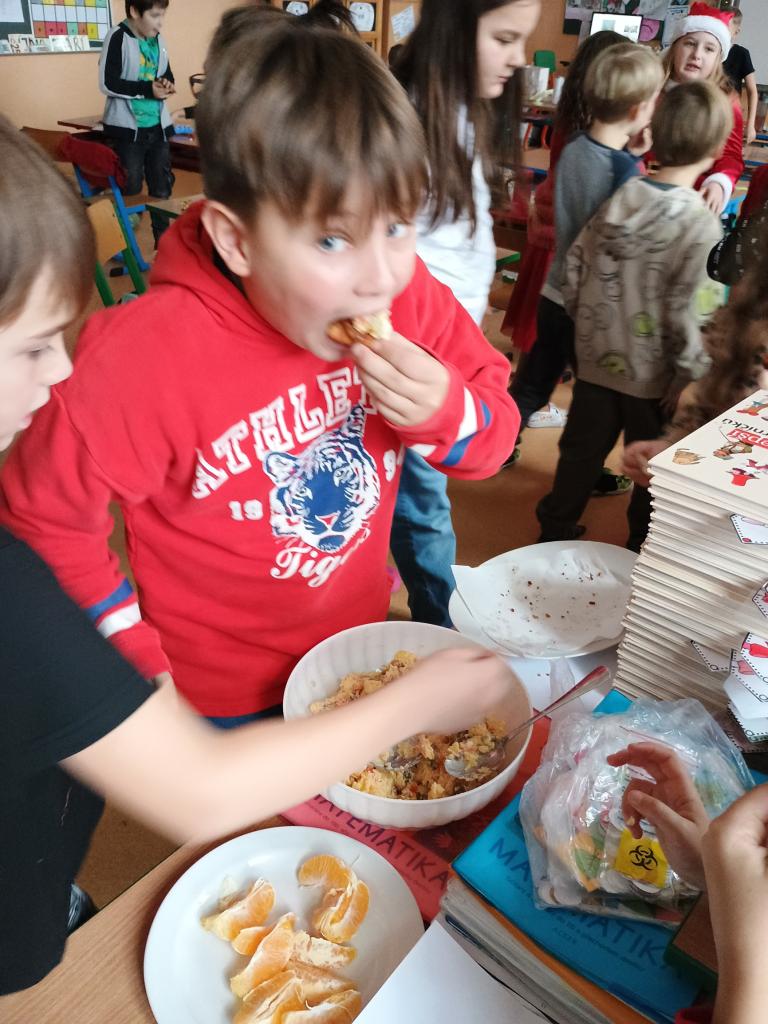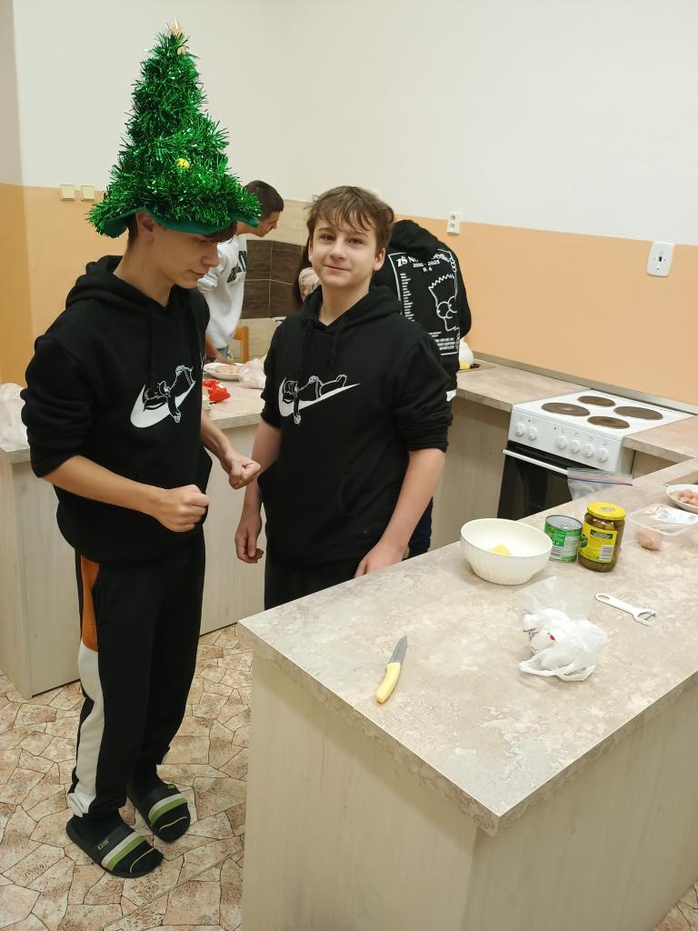 Jako každý rok si i letos devítka neodpustila vánoční vaření. Někteří si připravovali klasický bramborový salát a řízek, někteří dali přednost bramborové kaši. Ochutnat dostali dokonce i žáci 2. třídy. A aby vánoční atmosféra byla úplná, upekli si k tomu vánoční perník a brownies a dokonce si zazpívali s dětmi z prvního stupně. Celé dopoledne v kuchyňce zněly vánoční písničky, které si žáci s chutí zazpívali. Poslední vaření jsme si opravdu užili.