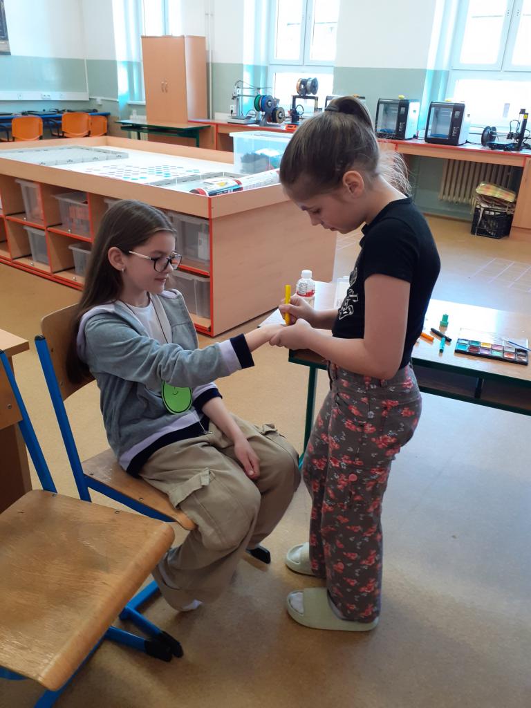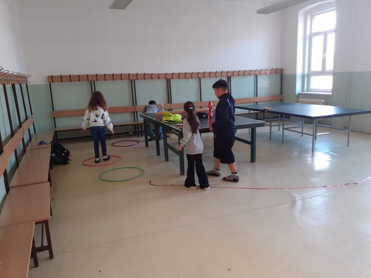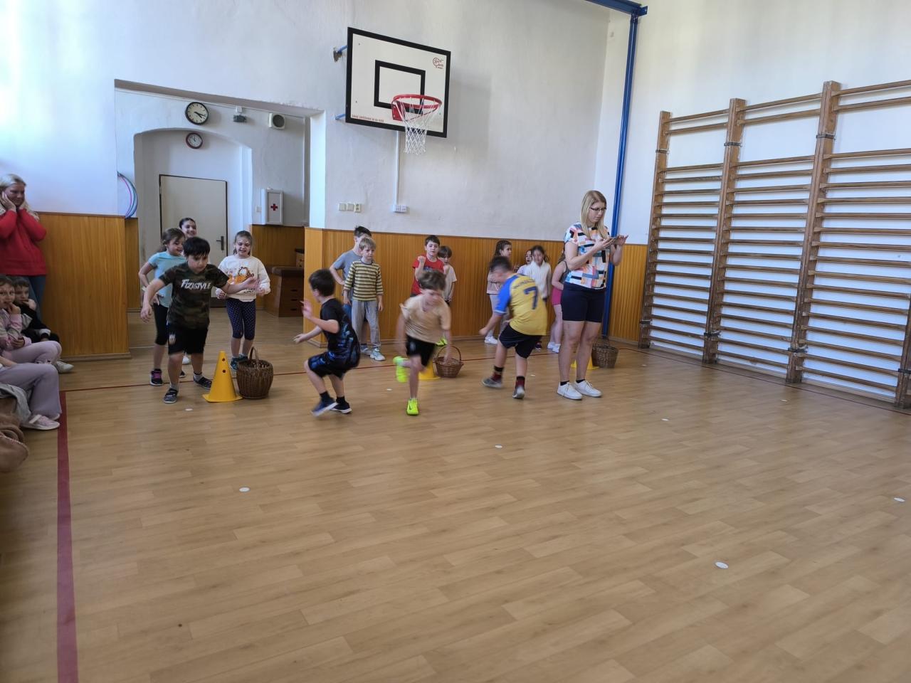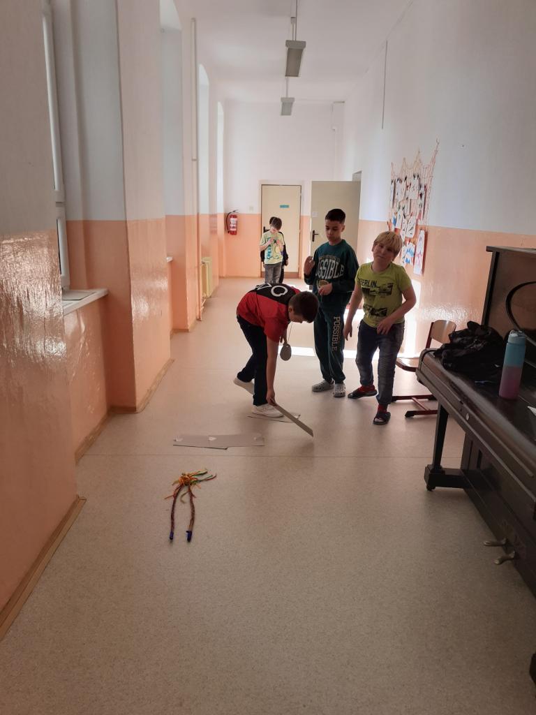 "Jdeme do toho,"řekli si páťáci a už vyráběli medaile, vymýšleli soutěžní disciplíny. A tak se ve středu 16.4. házelo vlaštovkami, nosilo vajíčko na lžíci, překonávaly se bažiny, shazovaly kuželky, malovalo na obličej, obtiskávaly ruce a nakonec se soutěžilo v tělocvičně.....Při procházce pak žáci objevovali názvy velikonočních dnů a plnili úkoly.