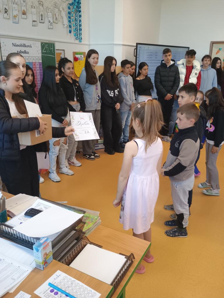Začátkem dubna jsme vás informovovali o Velikonoční stezce, kterou pro žáky naší školy připravili žáci devátého ročníku. V pondělí proběhlo na prvním stupni vyhodnocení. Na prvním místě se umístila pátá třída, na druhém místě se umístila druhá třída a na třetím místě se umístila třetí třída. Třídy obdržely diplom a sladkou odměnu. Podle počtu odevzdaných odpovědí je vidět, že jste si soutěž užili.