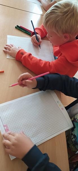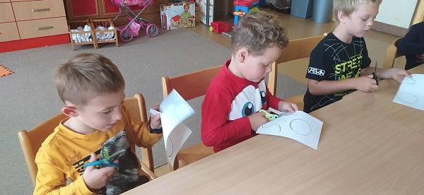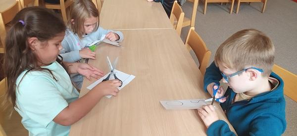 Družina zase začala a děti vytvářejí. Stříhaly papír podle čar, malovaly pixelový obrázek, proplétaly namalované sově břicho a lepily natrhané kousky papíru na nakreslenou houbu.