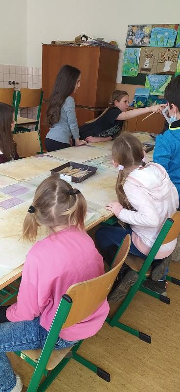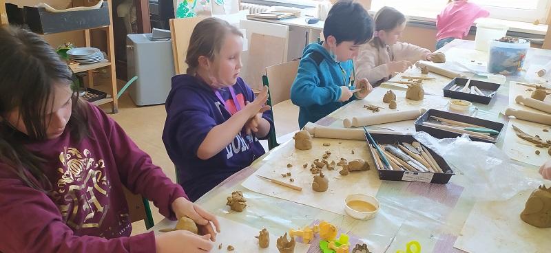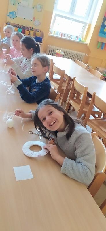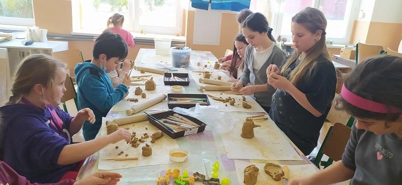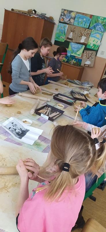 Děti z družiny navštívily keramickou dílnu, z hlíny tvořily slepičky, kohouty, vajíčka aj. výrobky. V družině na Velikonoce z chemlonu a z tvrdého papíru udělaly ovečku.