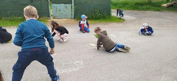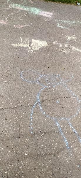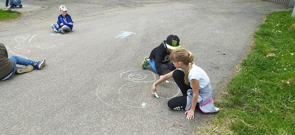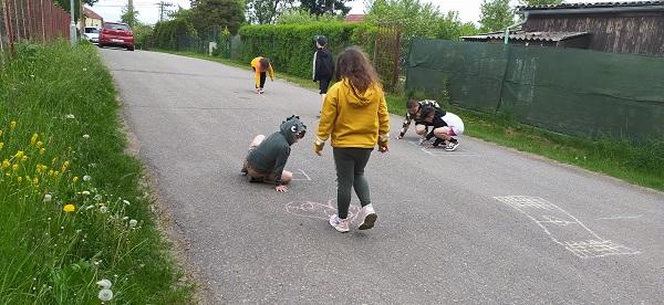 Děti namalovaly křídami dinosaury, kluka Maxe, jeho holčičku, nejdelšího panáka na skákání o 131 políček a další kresby.