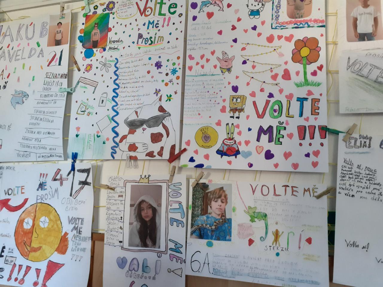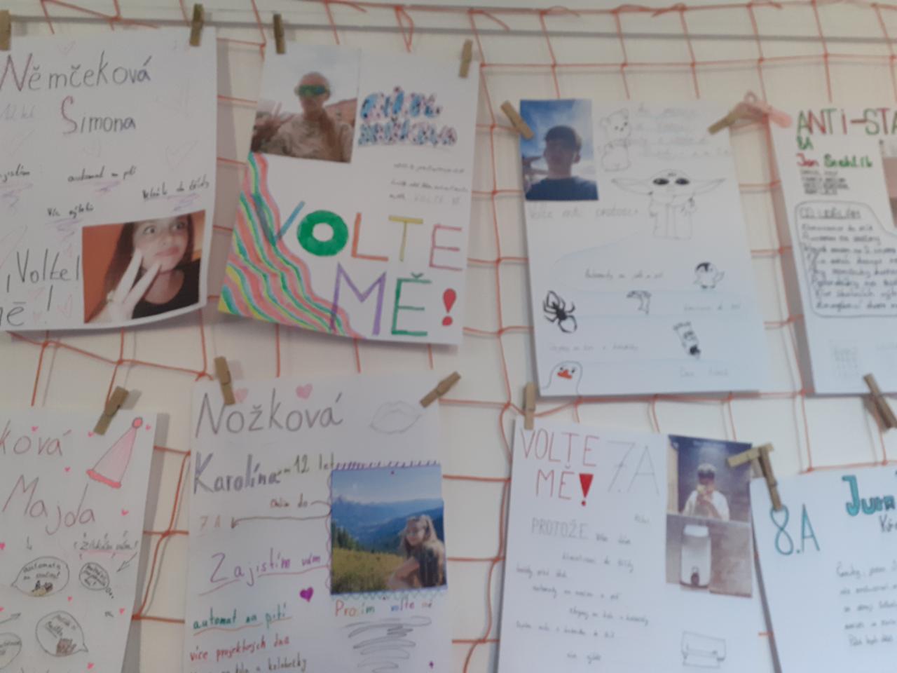 Každý kandidát připravil svůj volební plakát, kde stručně představil sebe i své cíle. Plakáty si žáci mohou prohlédnout na chodbách školy.